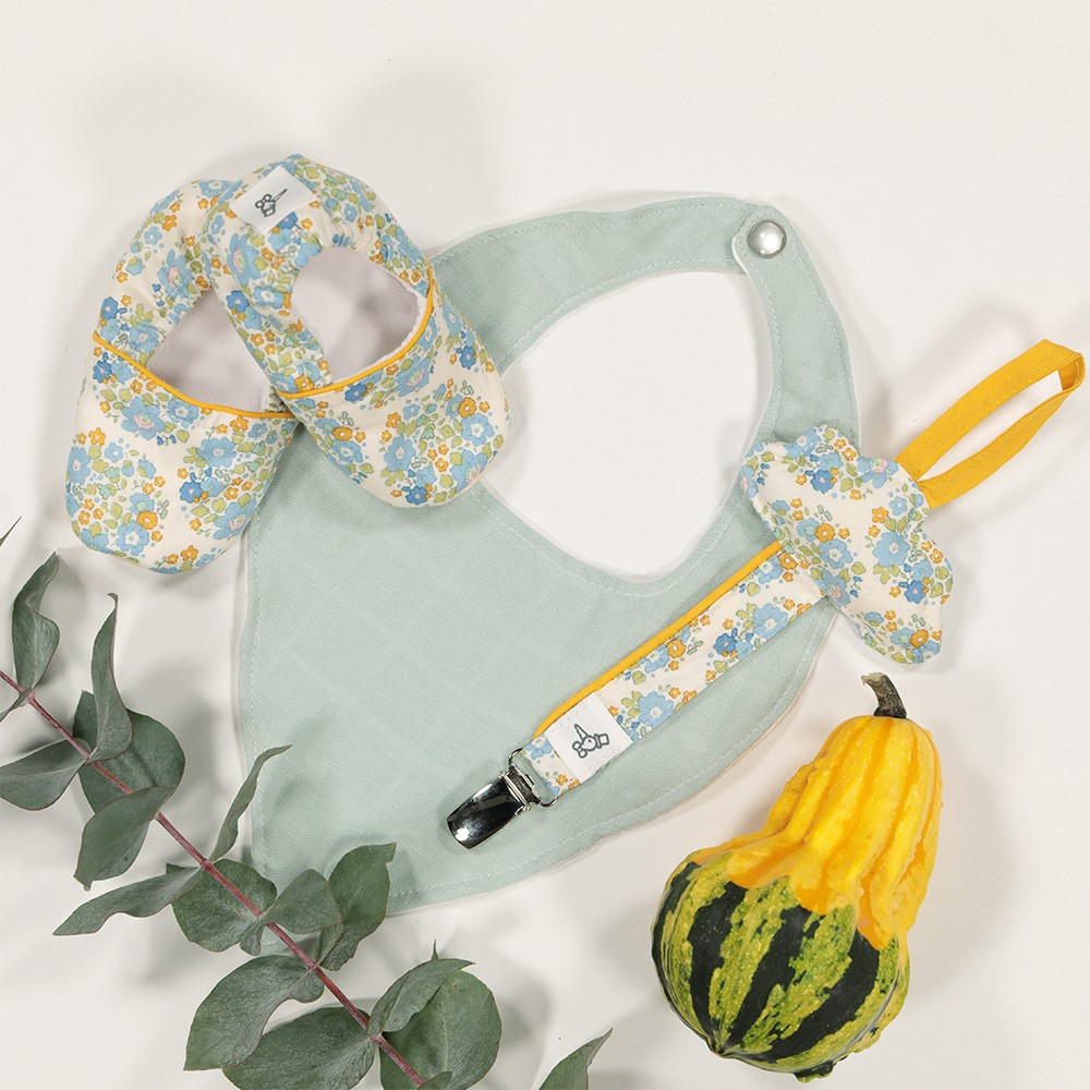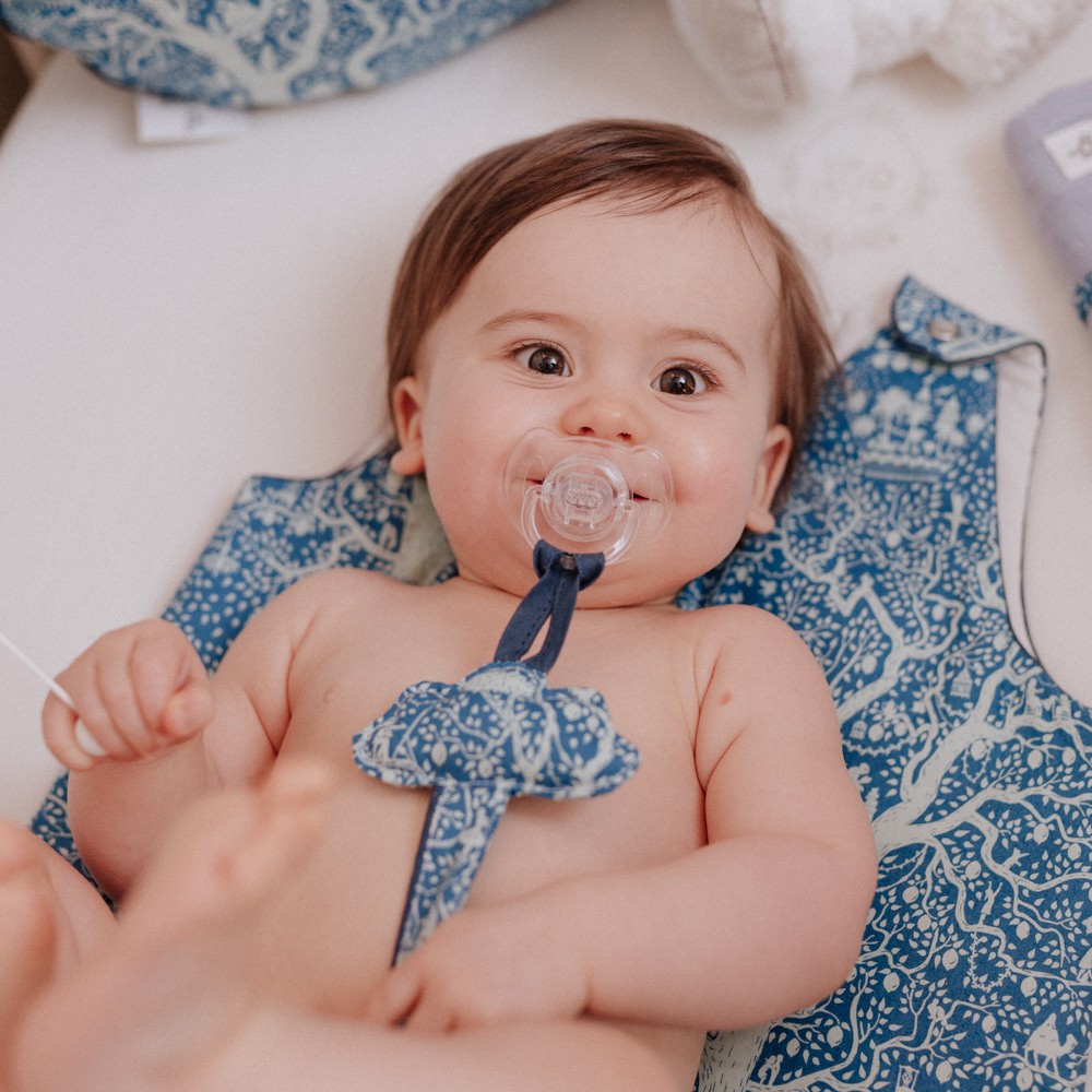 Un accessoire indispensable dans la vie de bébé pour ne jamais perdre sa tétine adorée et ne plus la faire tomber par terre, un joli petit nuage moelleux vient orner cet attache tétine. Dimensions 25cm avec pince Tissu imprimé 100% coton Oeko-tex, ouate de rembourrage 100% polyester, pince métal, biais et passepoil polycoton Article vendu sans tétine Lavage à la main recommandé Ne pas utiliser pour dormir, cet article n’est pas un jouet.