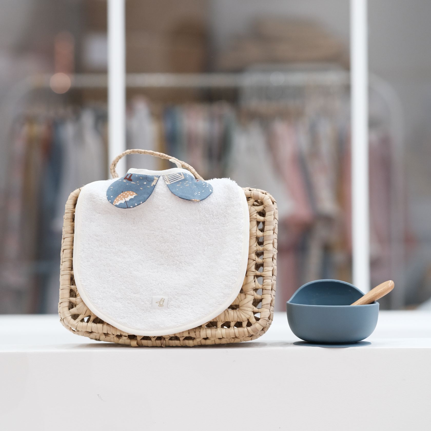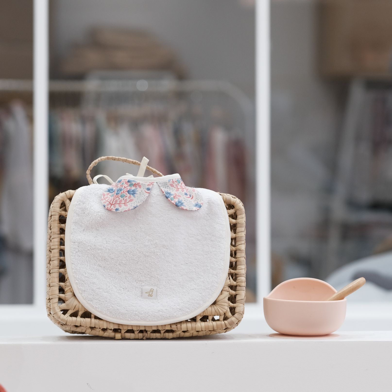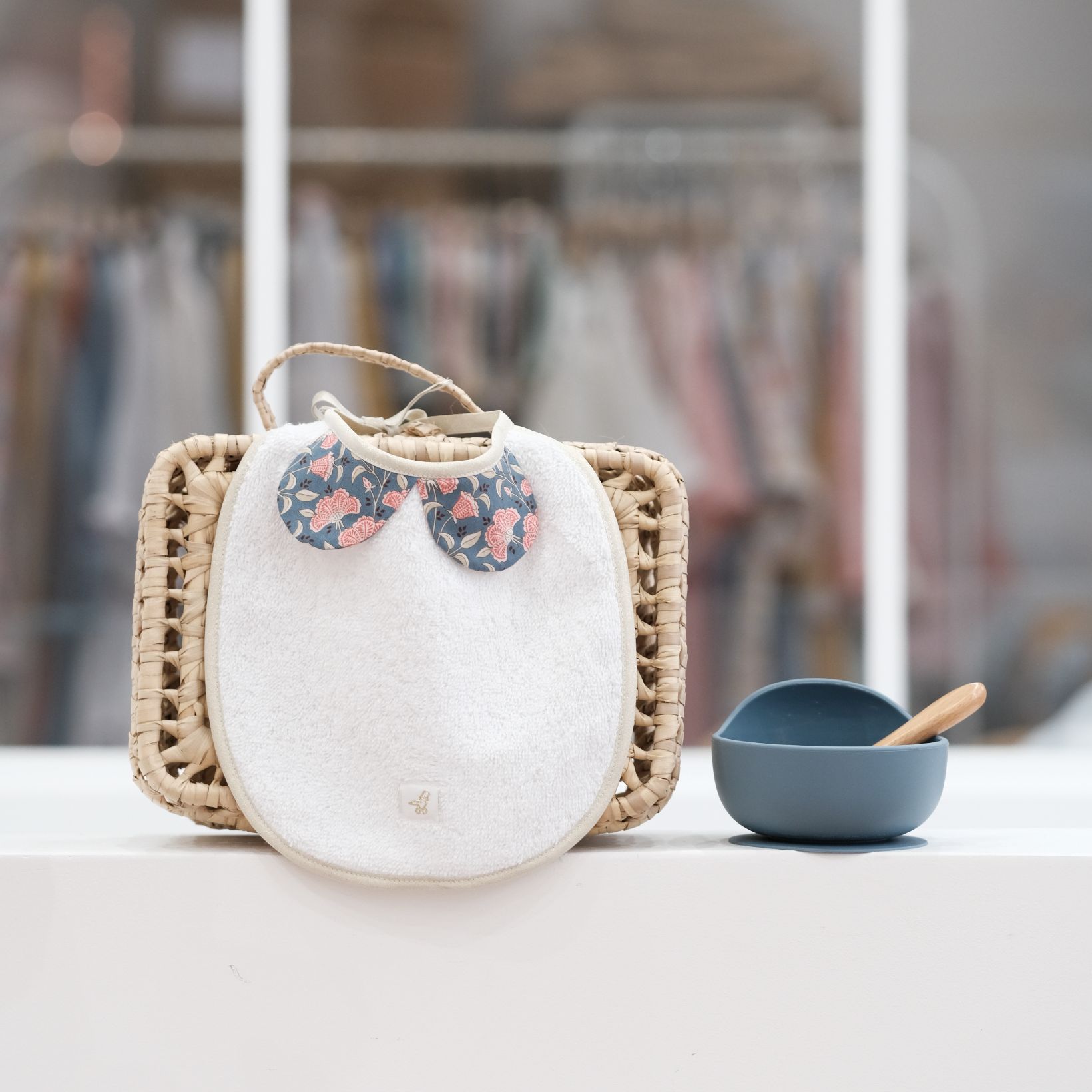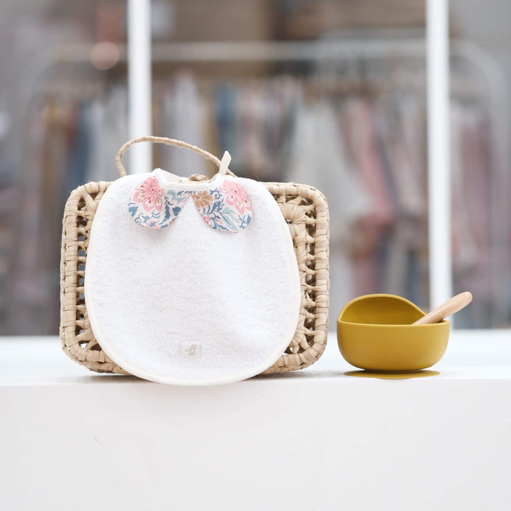 Un bébé toujours chic… dans son bavoir col Claudine