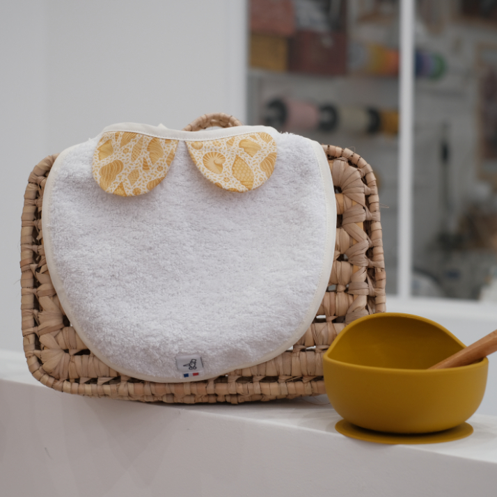 Chic et tendance, ce bavoir col Claudine au petit air rétro et tissu éponge tout doux séduira enfant et parents. Une petite touche de tendresse made in France à nouer autour du cou de bébé… ou à offrir en cadeau de naissance !