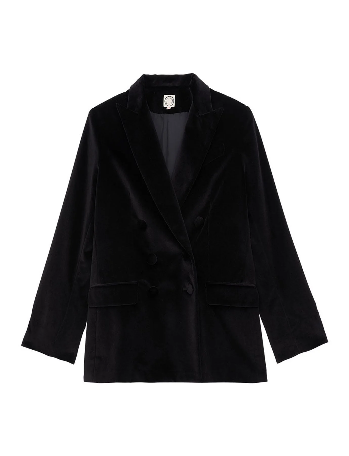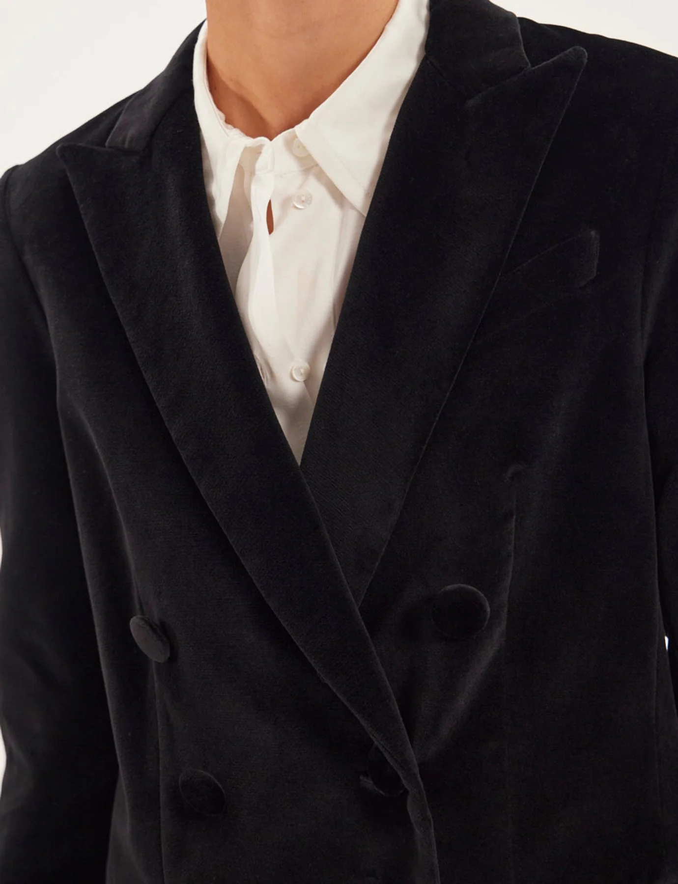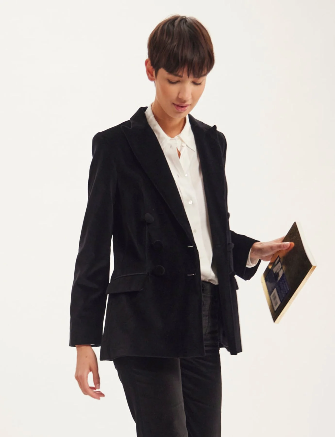 Découvrez la nouvelle veste Ezio. Cette veste croisée très élégante, que l’on peut porter ouverte ou fermée, représente le chic parisien. Elle peut être portée avec la jupe assortie/pantalon assorti. Double boutonnage avant avec boutons corne