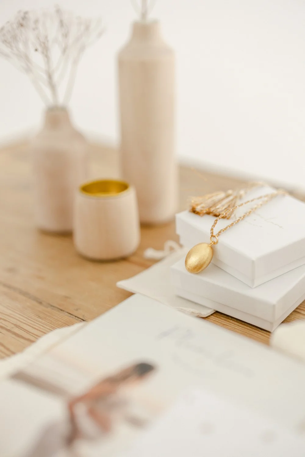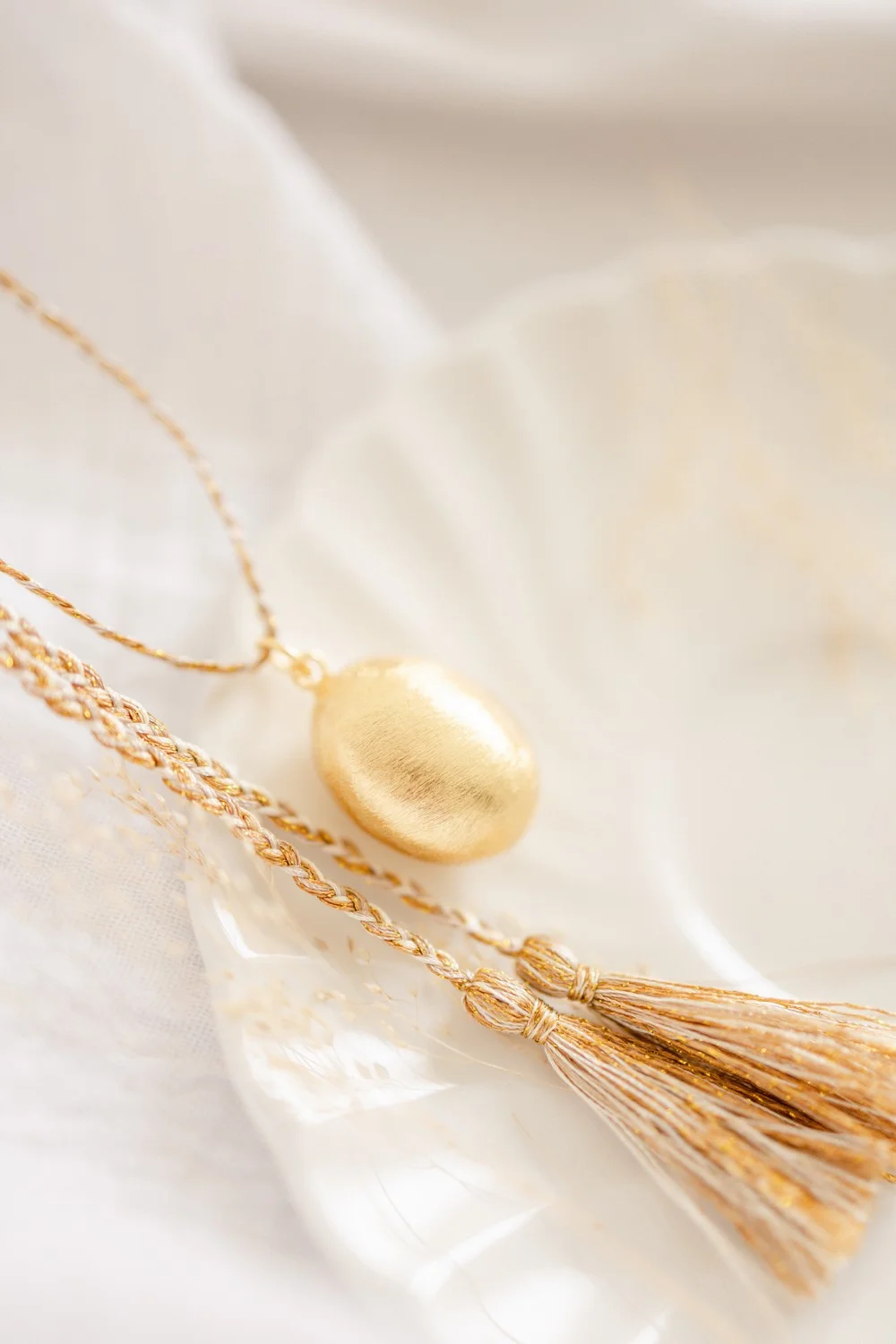- Pendentif sonore brossé à la forme d’un cocon recouvert d’or 18 carats ou d’argent