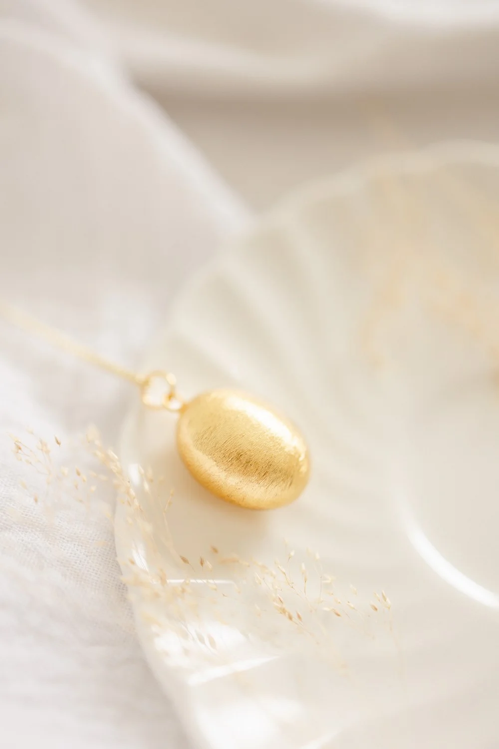 - Pendentif sonore brossé à la forme d’un cocon recouvert d’or 18 carats ou d’argent