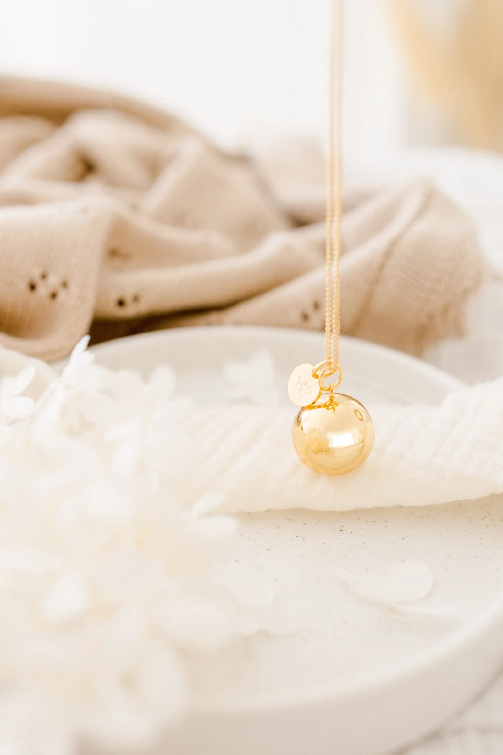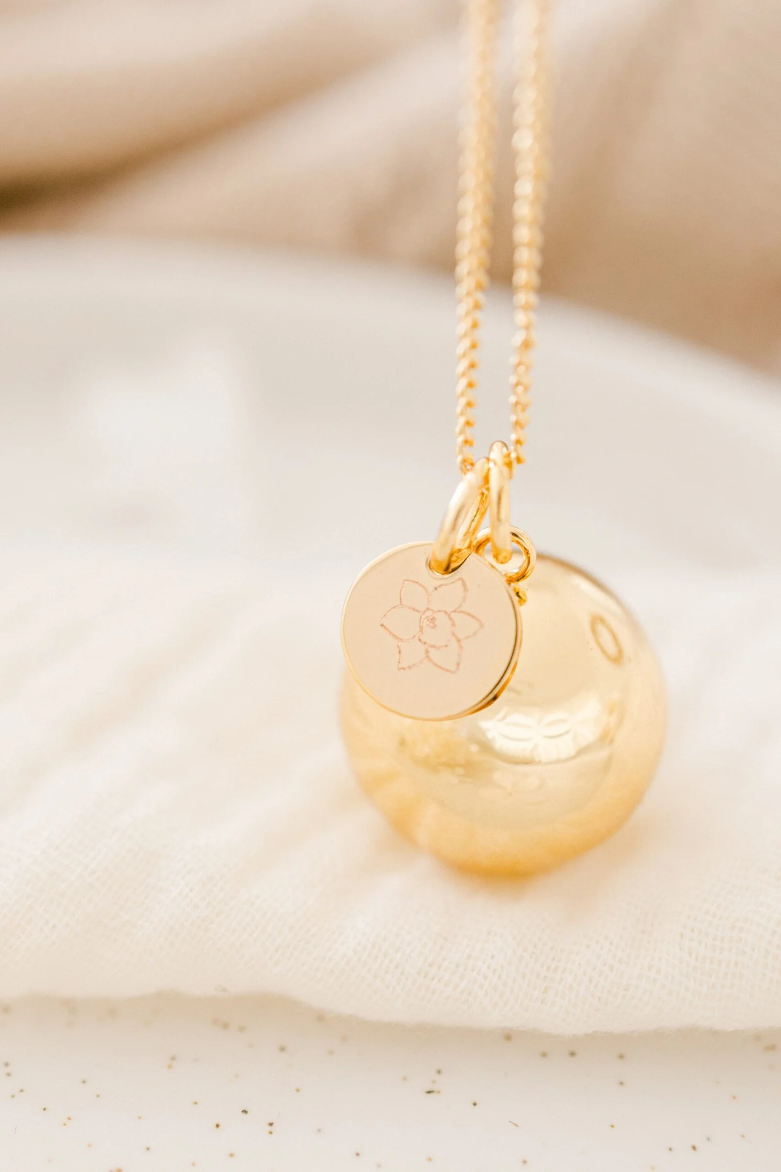 Notre bola de grossesse personnalisé fleur de naissance Eclosion fait écho au renouveau et à la floraison. Une ode à la vie où chaque mois donne naissance à une fleur. Un bijou floral doré à l’or fin 18 carats imaginé pour honorer un lien, célébrer l’éclosion de la vie. Chacune des fleurs de ce bijou a été imaginée puis dessinée en étroite collaboration avec notre graphiste. Personnalisez le verso de ce pendentif avec vos mots doux : prénom, date de naissance, mot d’amour. Renforce le lien prénatal Apaise et protège maman et bébé Réconforte le nouveau-né Xylophone interne à la…