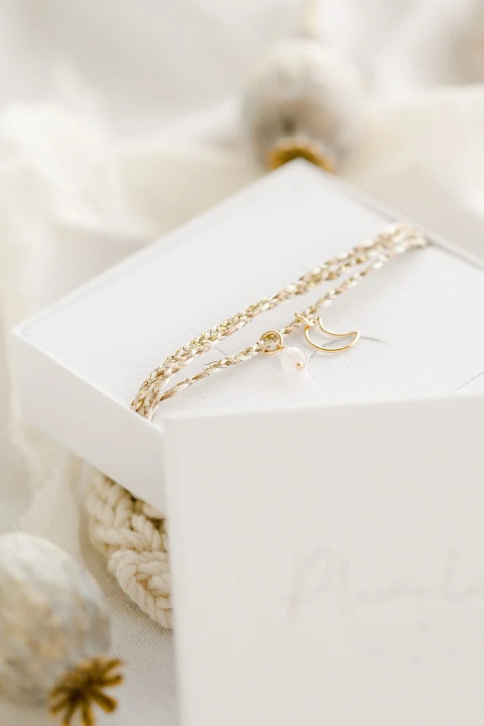 Bracelet personnalisé cordon de soie tressé médaille perlée or ÉPURE