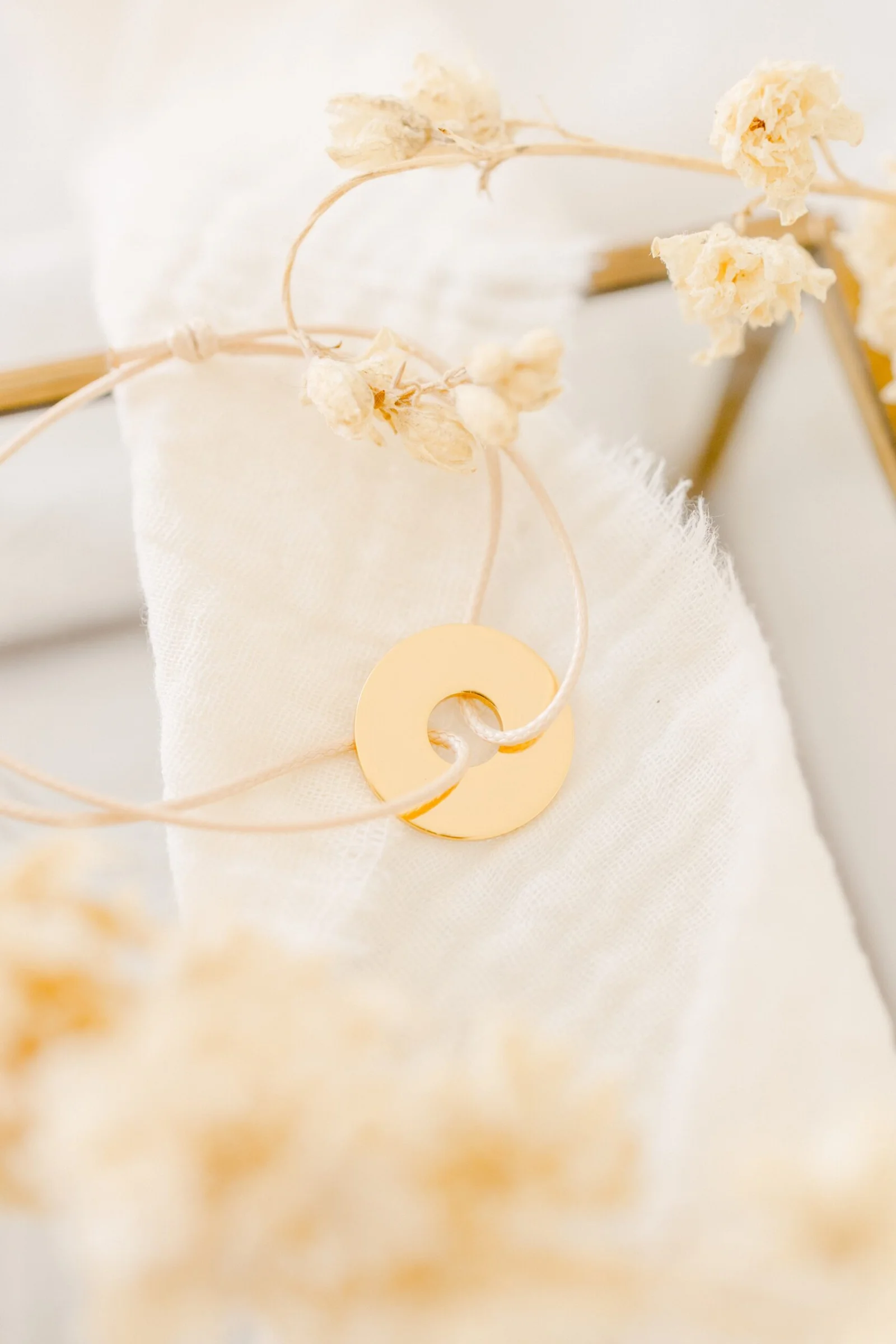 Notre bracelet médaille cible se personnalise avec vos précieux mots doux avant d’être joliment noué à votre poignet.