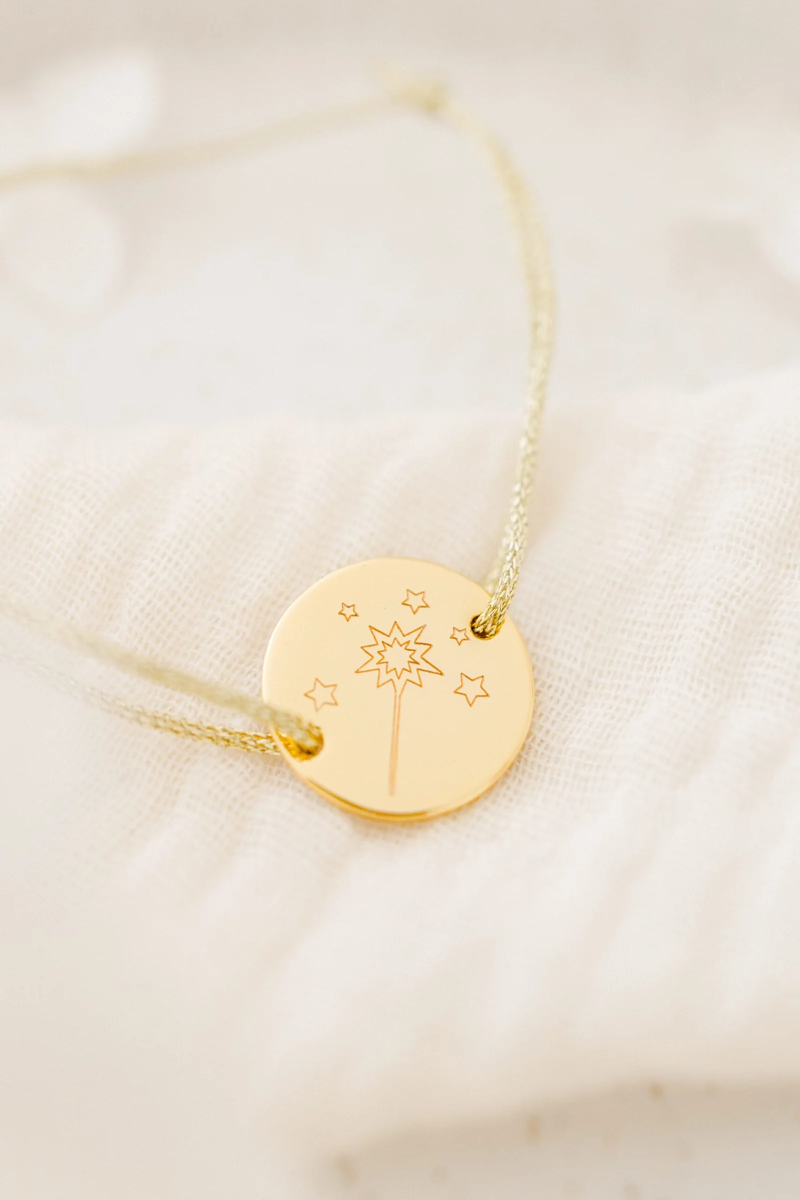 Notre bracelet médaille se personnalise avec vos précieux mots doux avant d’être joliment noué au poignet de votre enfant.