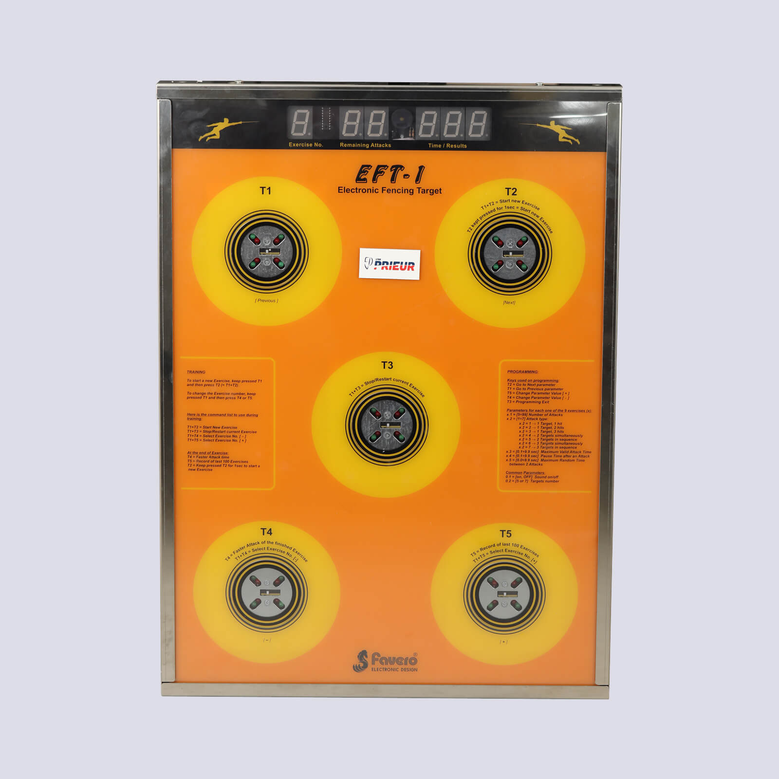 La cible d’entraînement escrime est composée de 5 cibles qui émettent une lumière rouge (lorsque la cible doit être touchée) et une lumière verte (lorsque la cible est touchée).