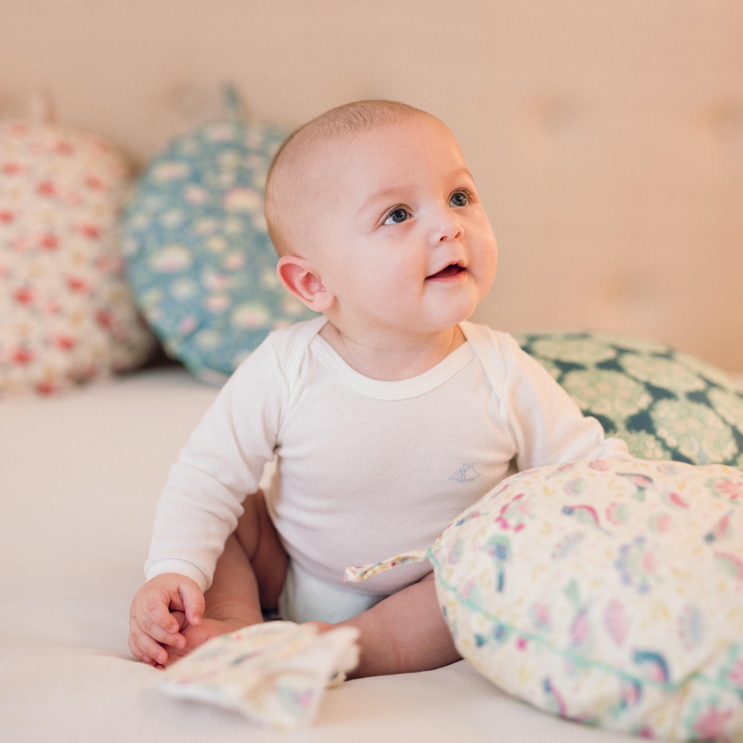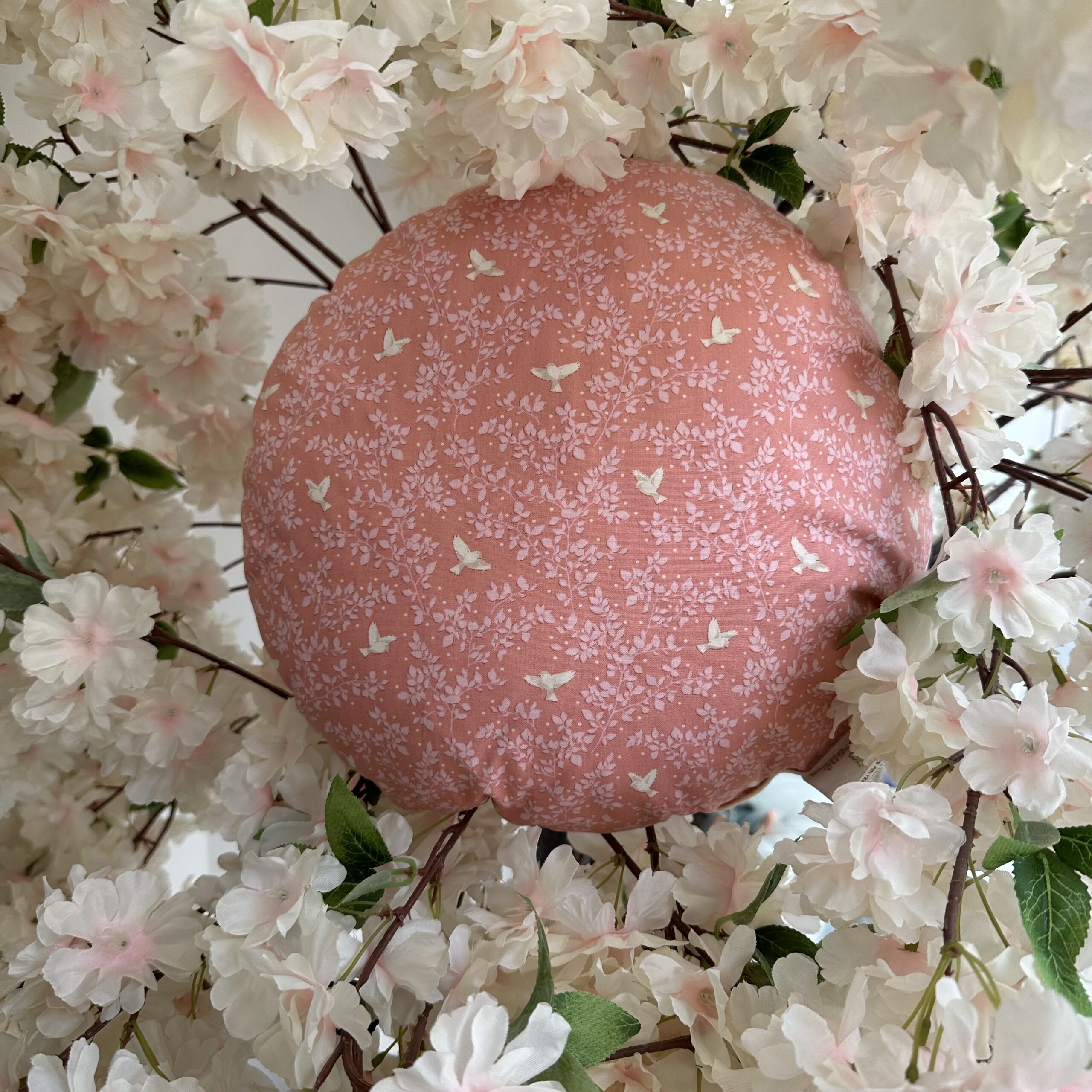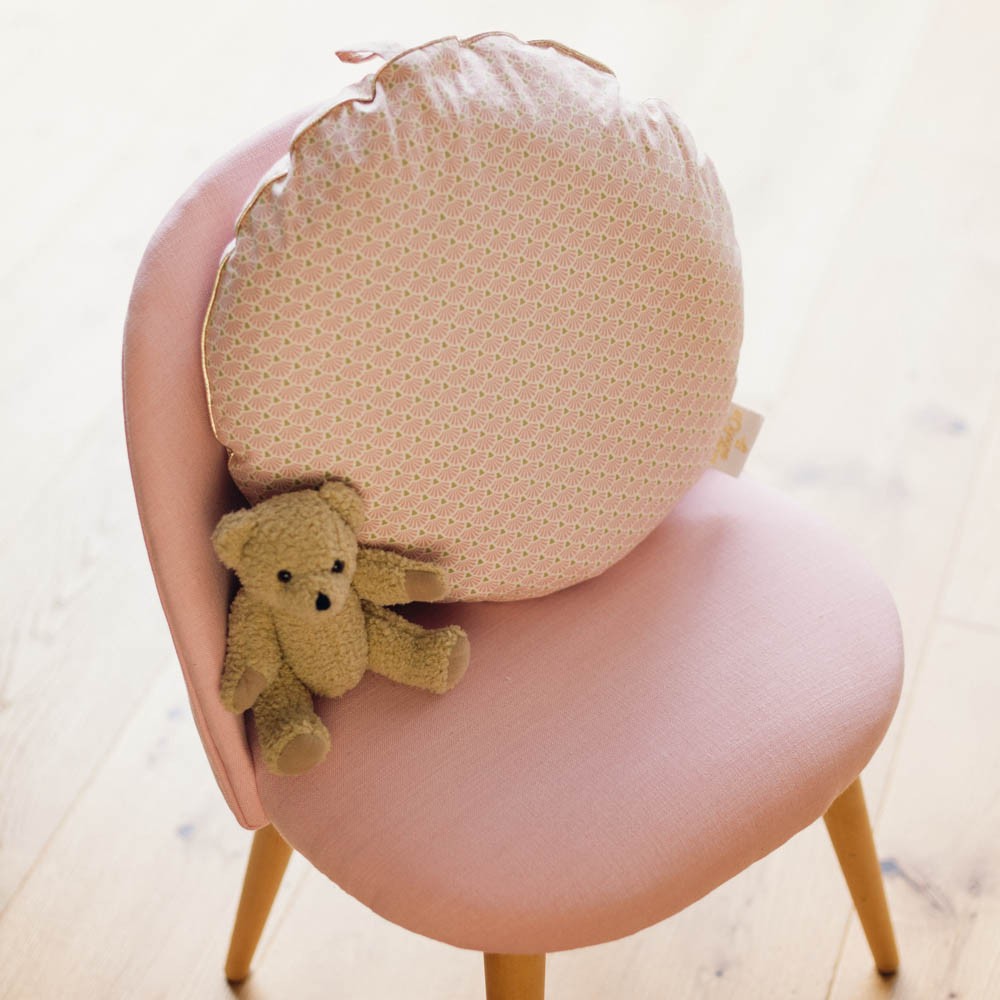 Un coussin rond ou rectangulaire bien moelleux qui trouvera sa place au pied du lit de bébé ou sur le rocking-chair de la chambre, un joli passepoil vient faire ressortir le tissu imprimé.