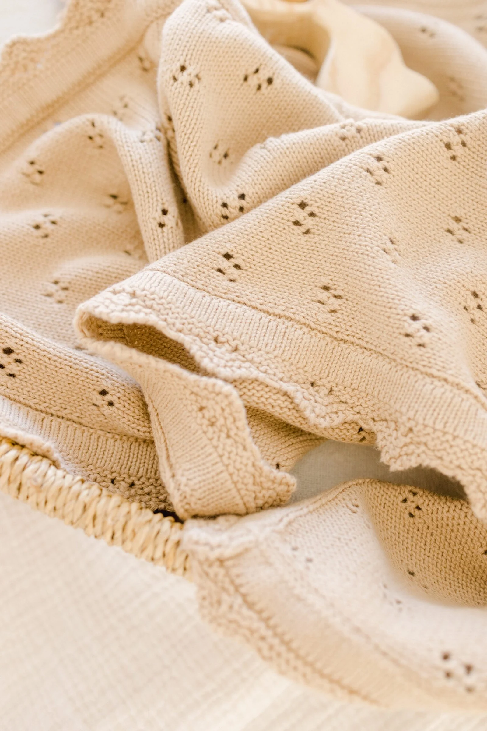 Grande couverture bébé tricotée taupe 100% coton BIENVENUE AU MONDE