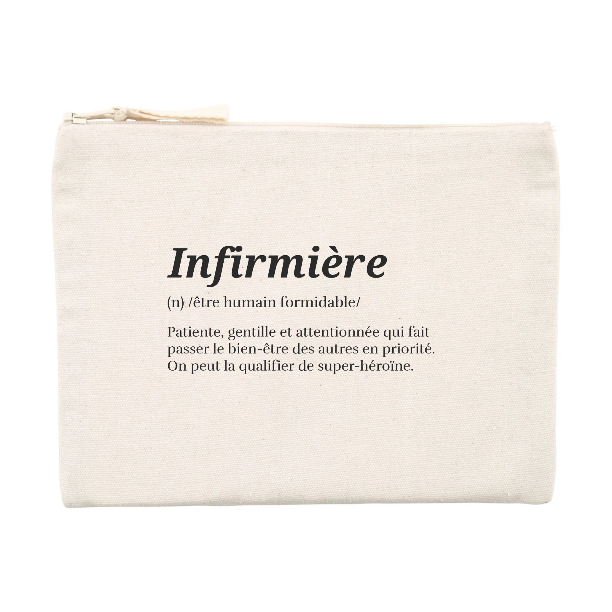 Une pochette d’excellente qualité Pochette 80% coton recyclé 🌱, 20% polyester recyclé Ouverture zippée Imaginée et imprimée en France Idée cadeau pour infirmiere Dimensions : 21.5 x 16 cm Lavable en machine, 30°C Peut servir de trousse, porte-monnaie ou trousse à maquillage