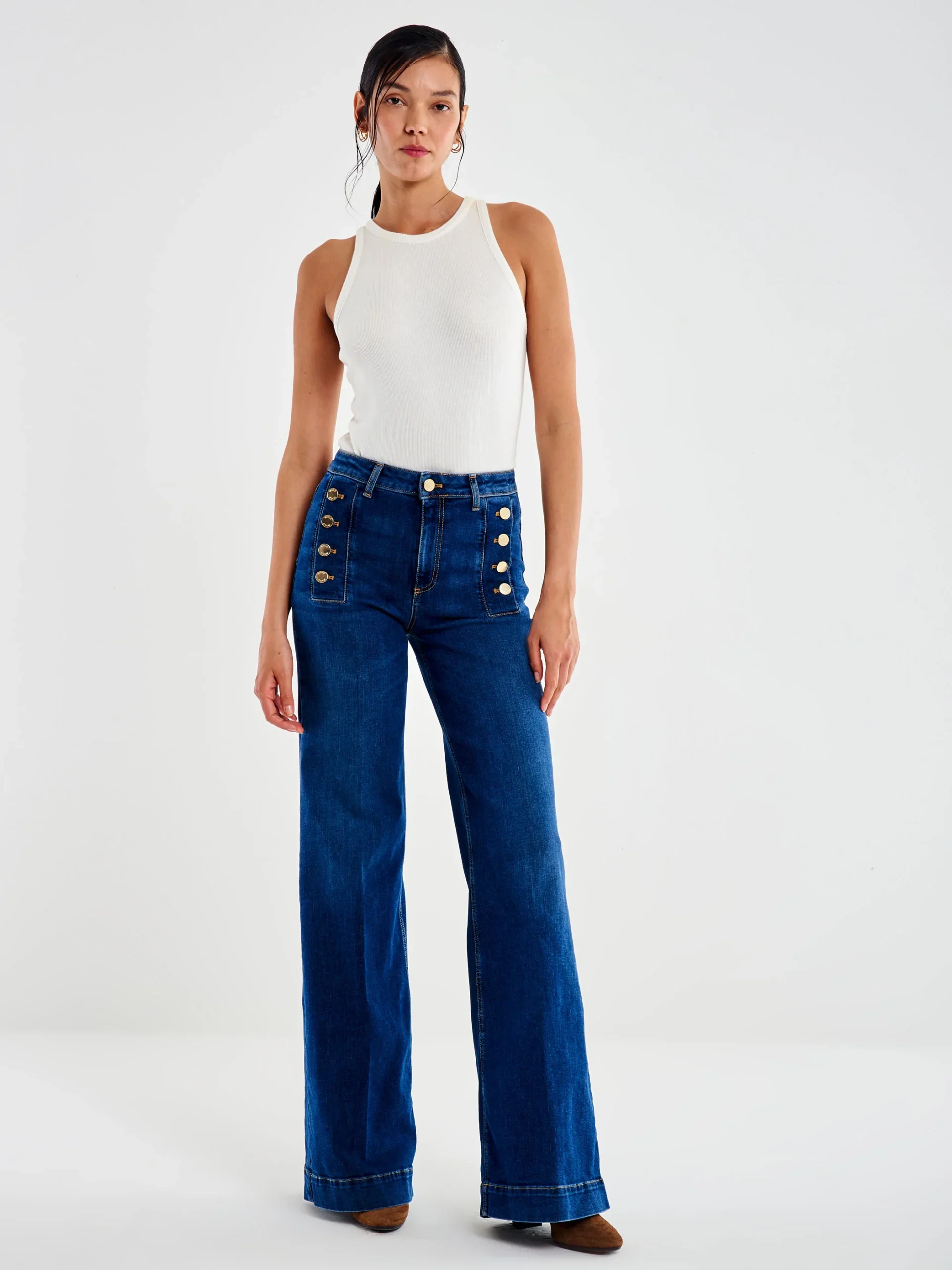 Silhouette élancée, jambe ample, allure parisienne. Notre jean palazzo taille haute allonge la jambe et capte la lumière grâce à son léger éclaircissement sur la cuisse. La patte de boutonnage ornée de boutons dorés signe un twist chic. Poches plaquées au dos, fermeture zip + bouton pour un porté confortable au quotidien.
