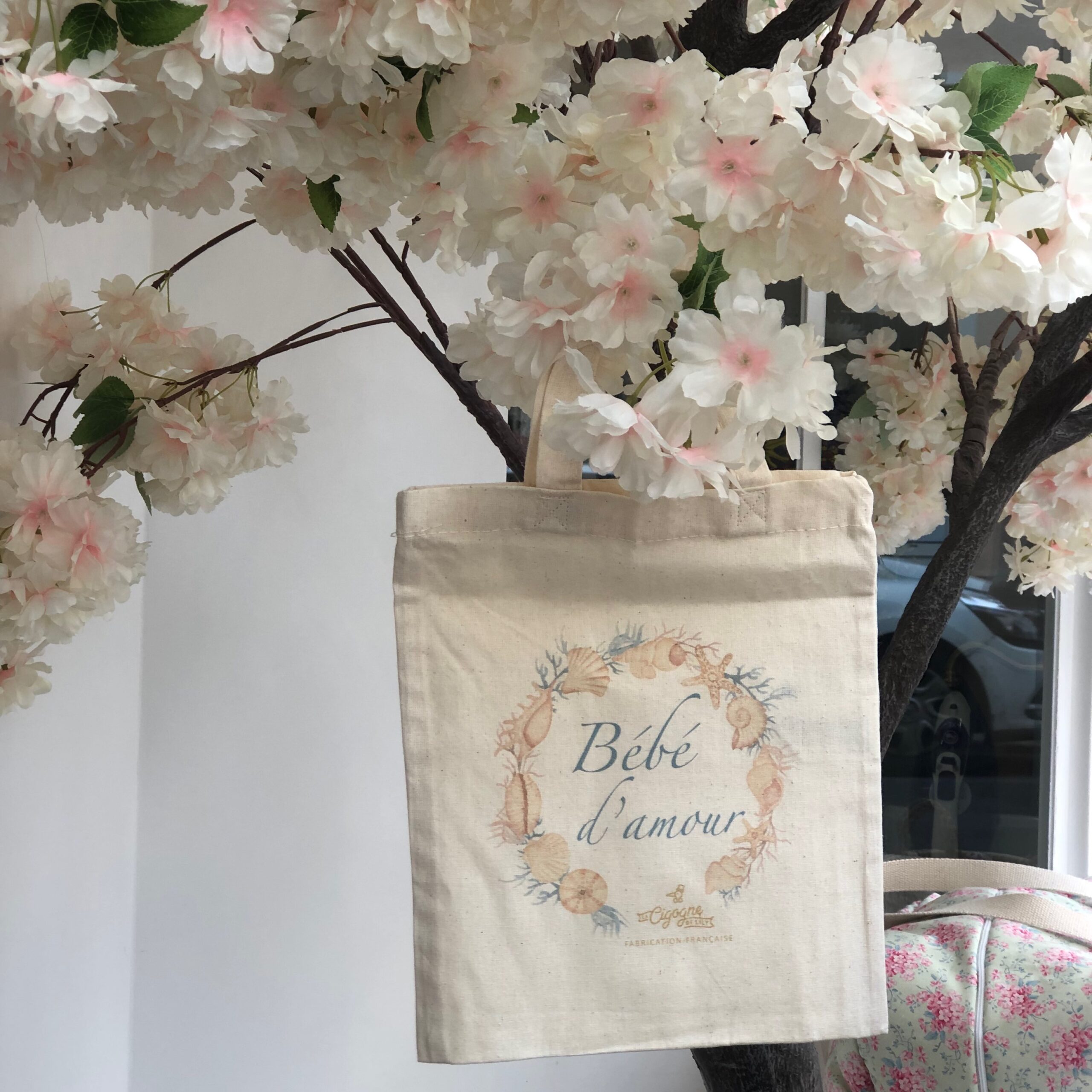 - Glisser un petit cadeau de naissance dans le mini tote bag ” Bébé d’amour “