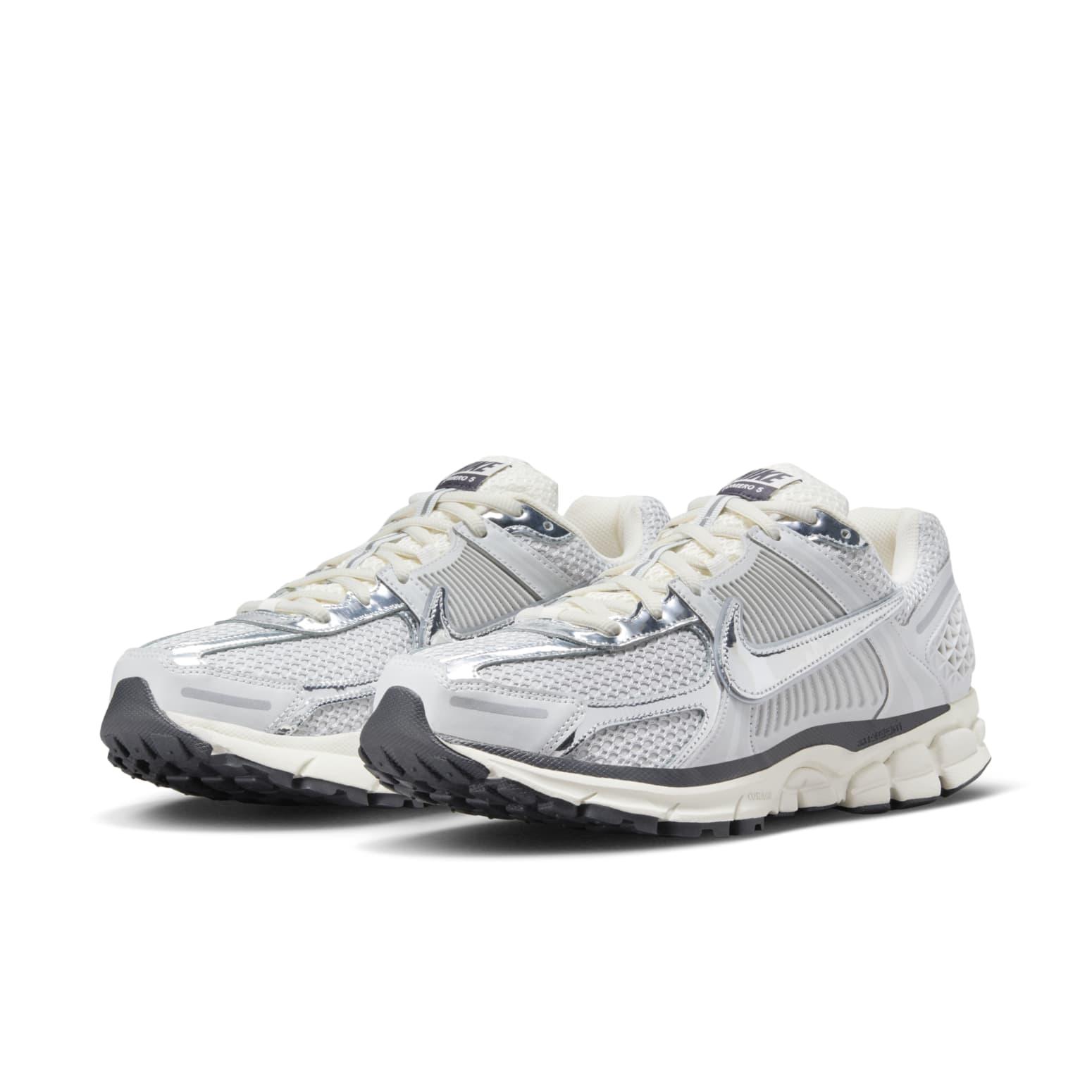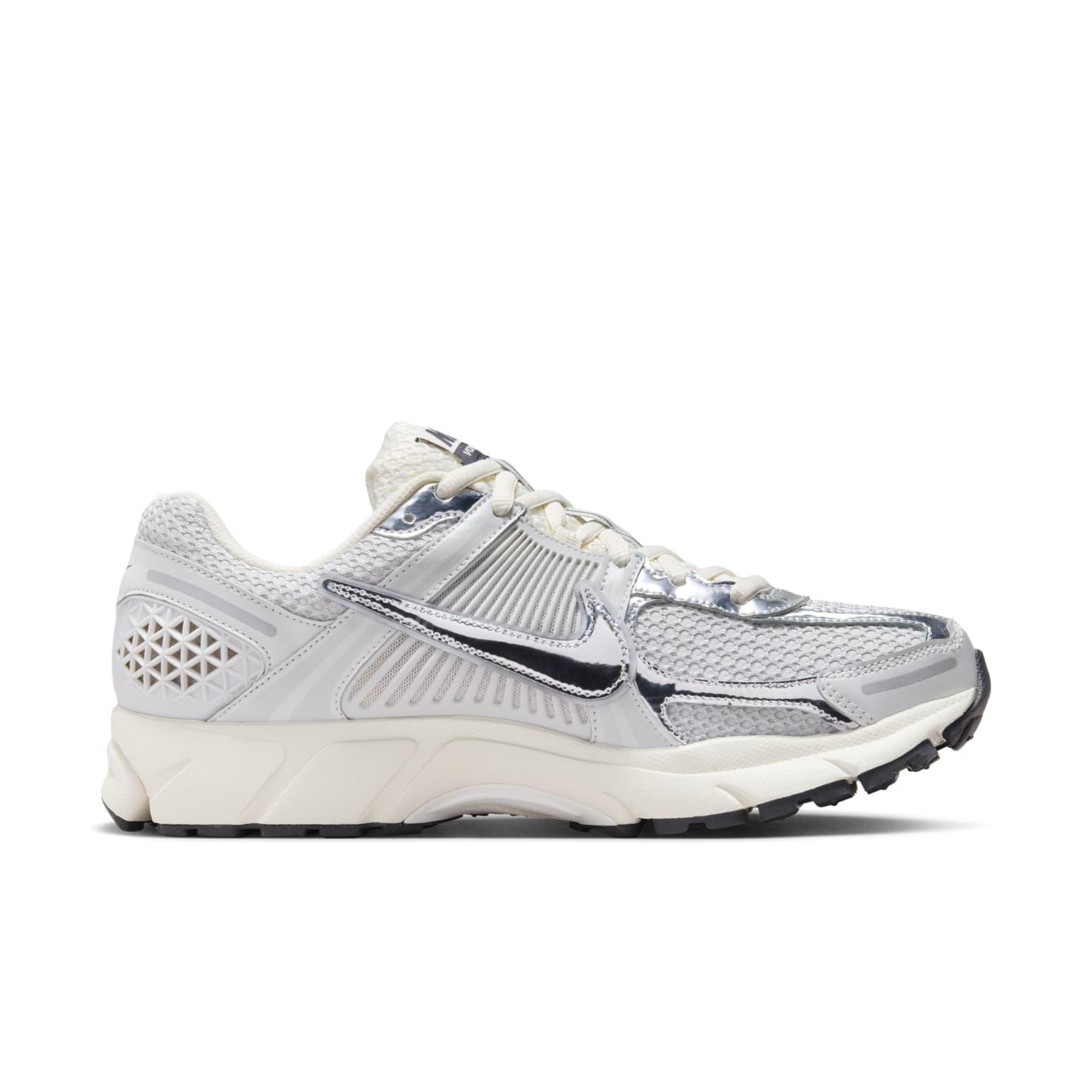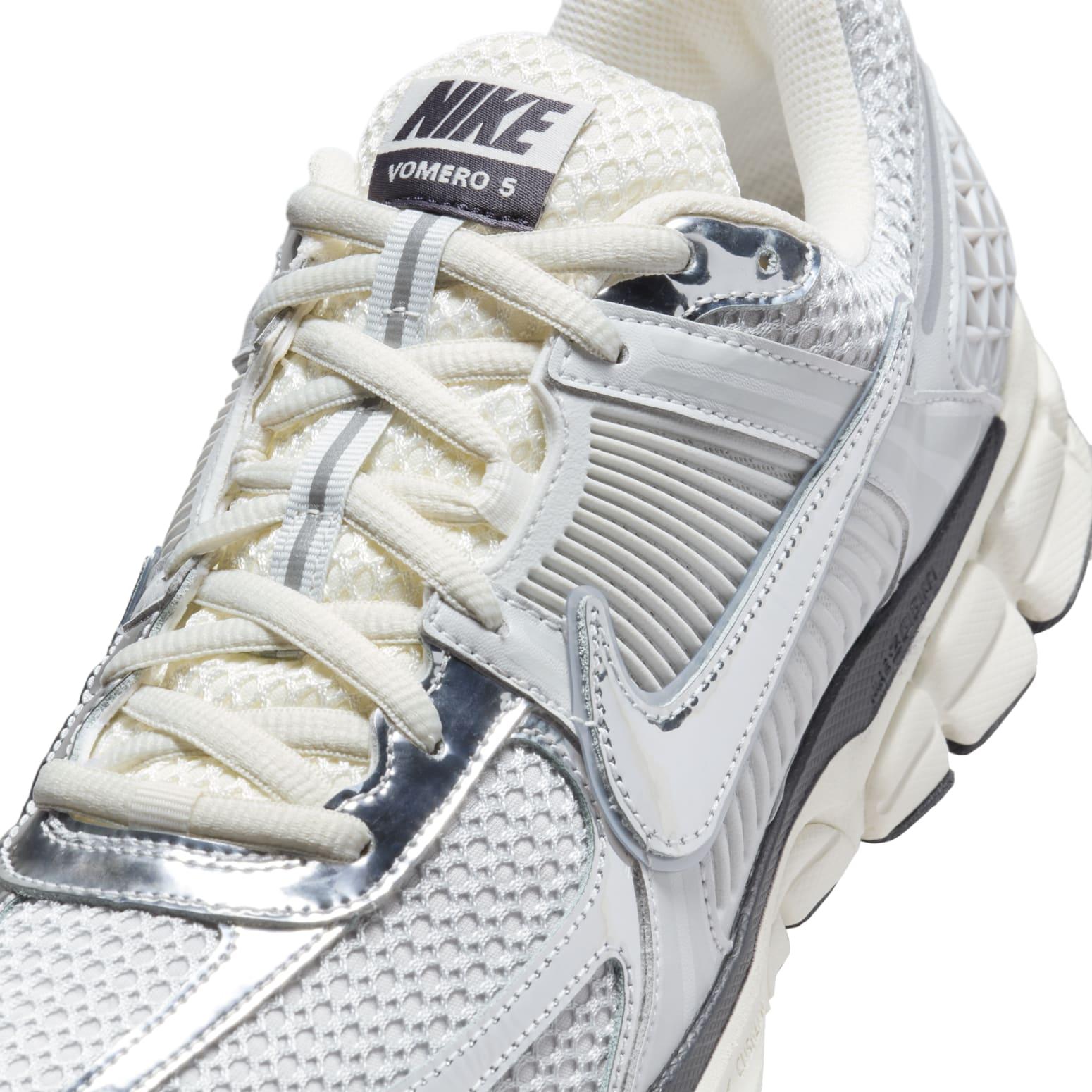 Les caractéristiques principales des Nike Air Zoom Vomero 5 Chrome incluent une tige en mesh respirant associée à des superpositions en cuir synthétique, une unité Zoom Air à l’avant et à l’arrière pour un amorti performant, une semelle intermédiaire en Cushlon pour un meilleur confort, ainsi qu’un clip en plastique au talon pour plus de stabilité. Le coloris « Chrome » présente des éléments réfléchissants brillants et une finition métallique fortement accentuée sur les détails.
