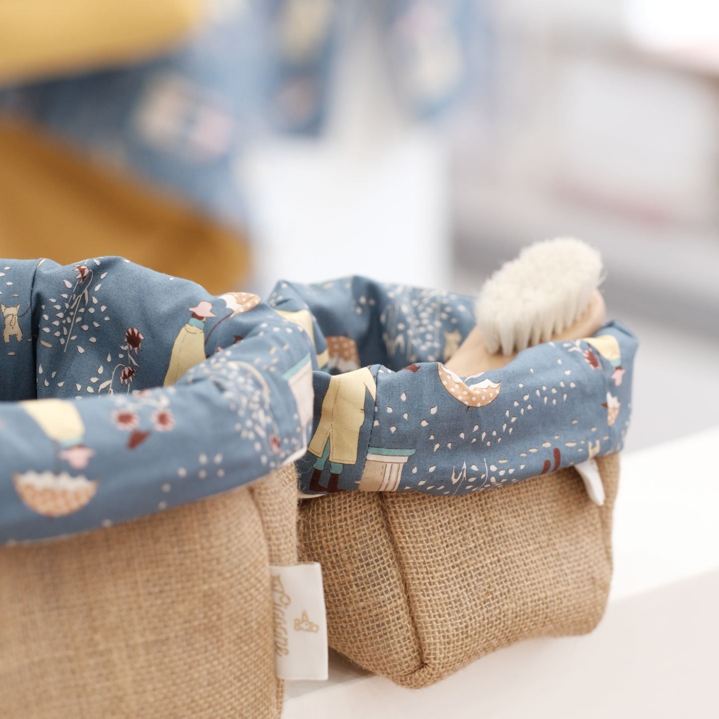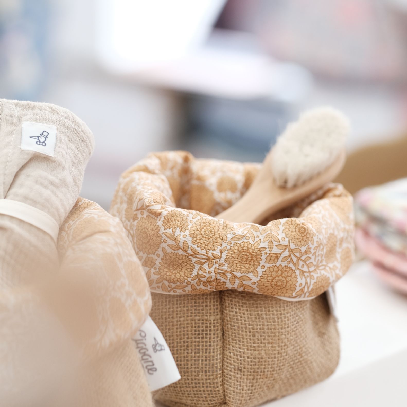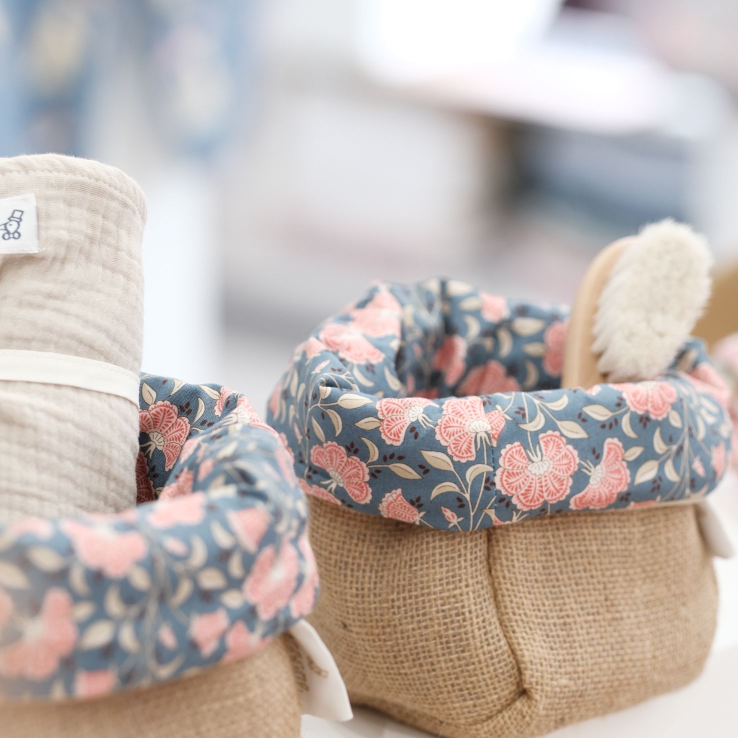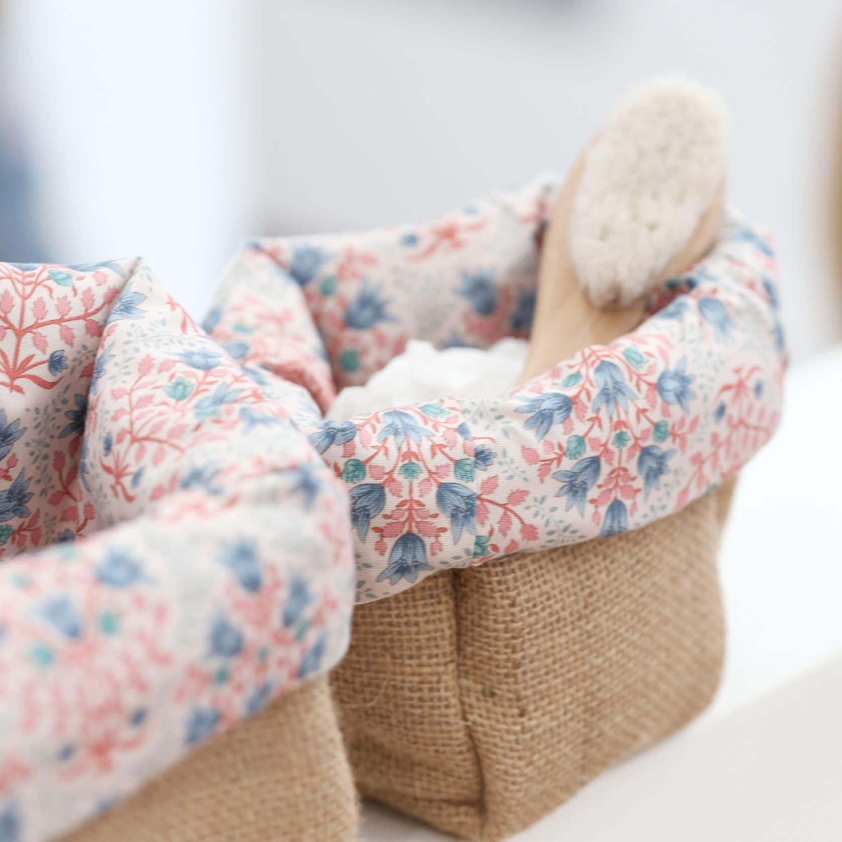 On craque pour ce petit panier de toilette en tissu et toile de jute, qui donnera une touche de chic à la salle de bain, la table à langer ou la chambre de bébé. Idéal pour un cadeau de naissance original, délicat… et made in France.