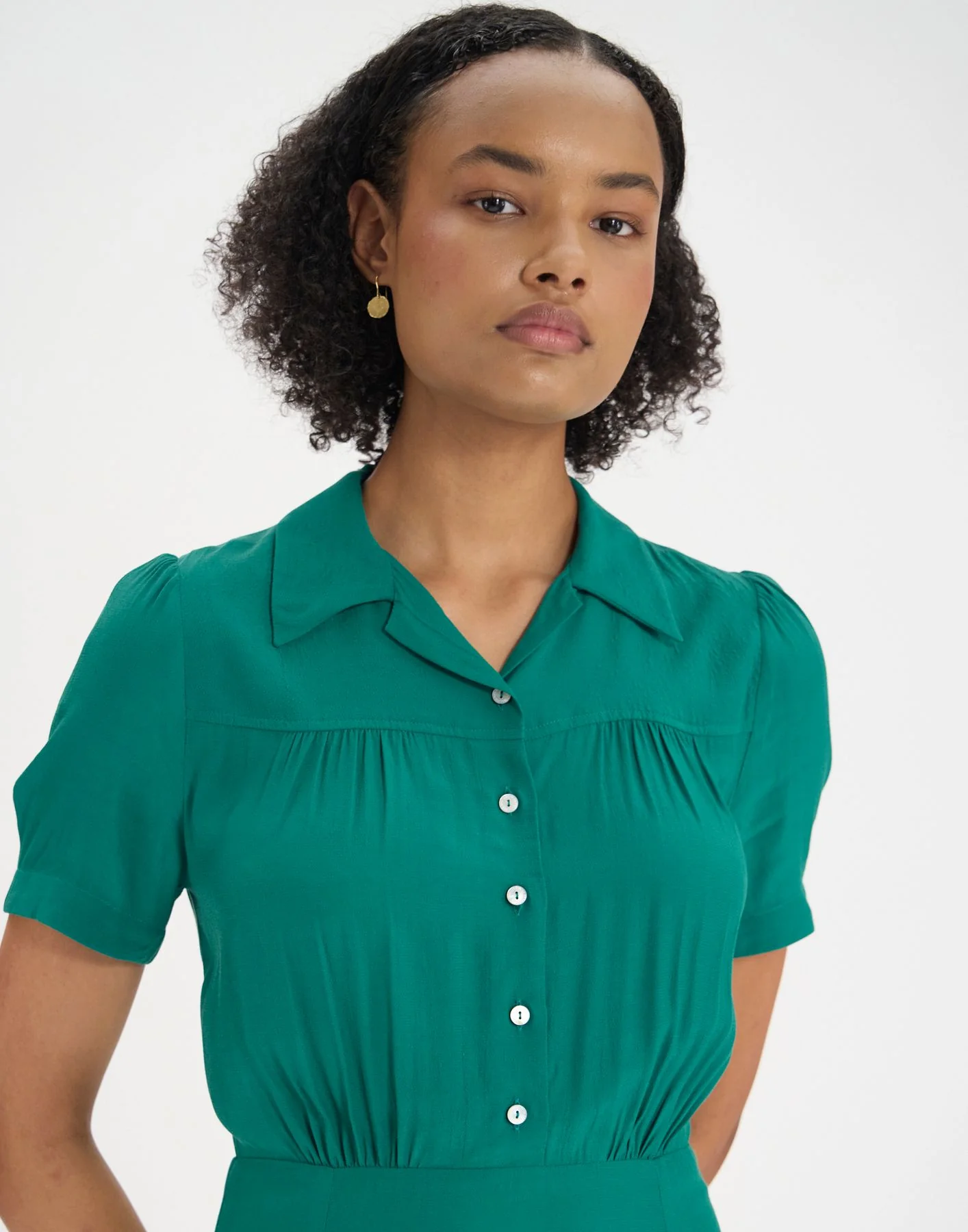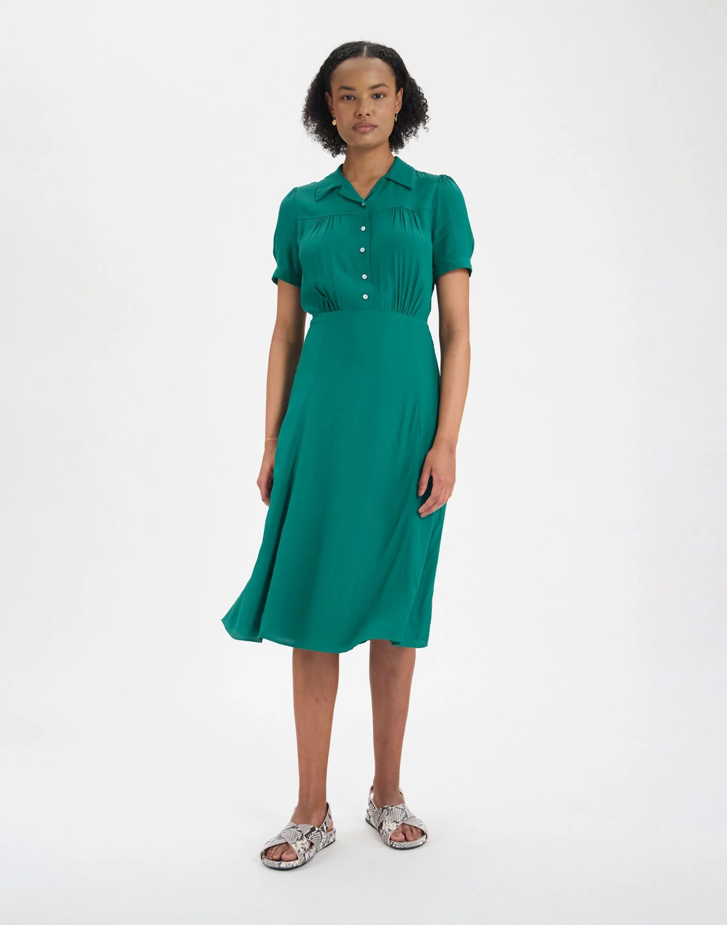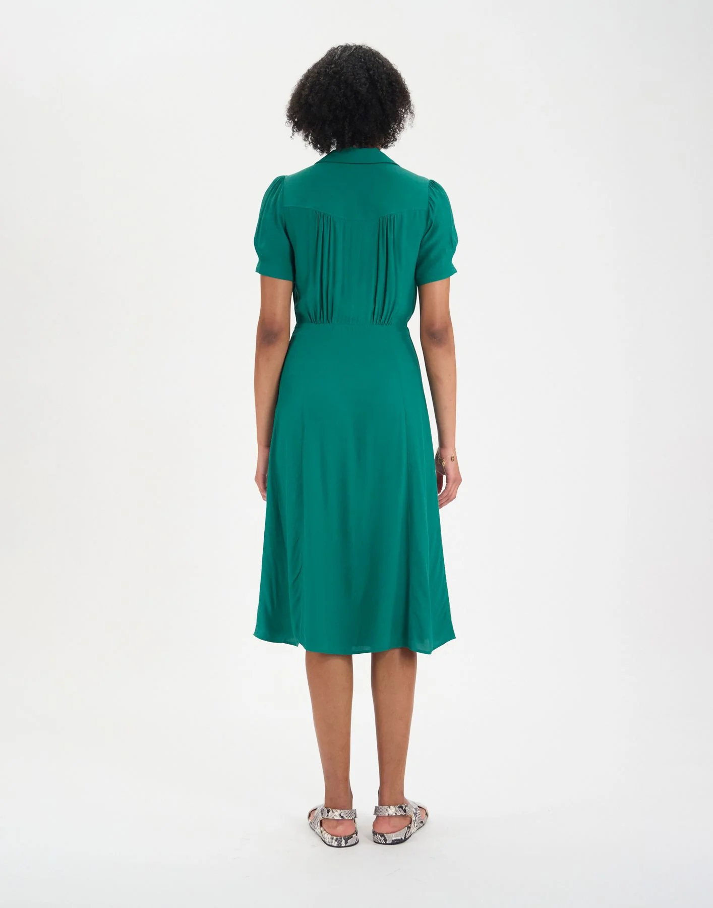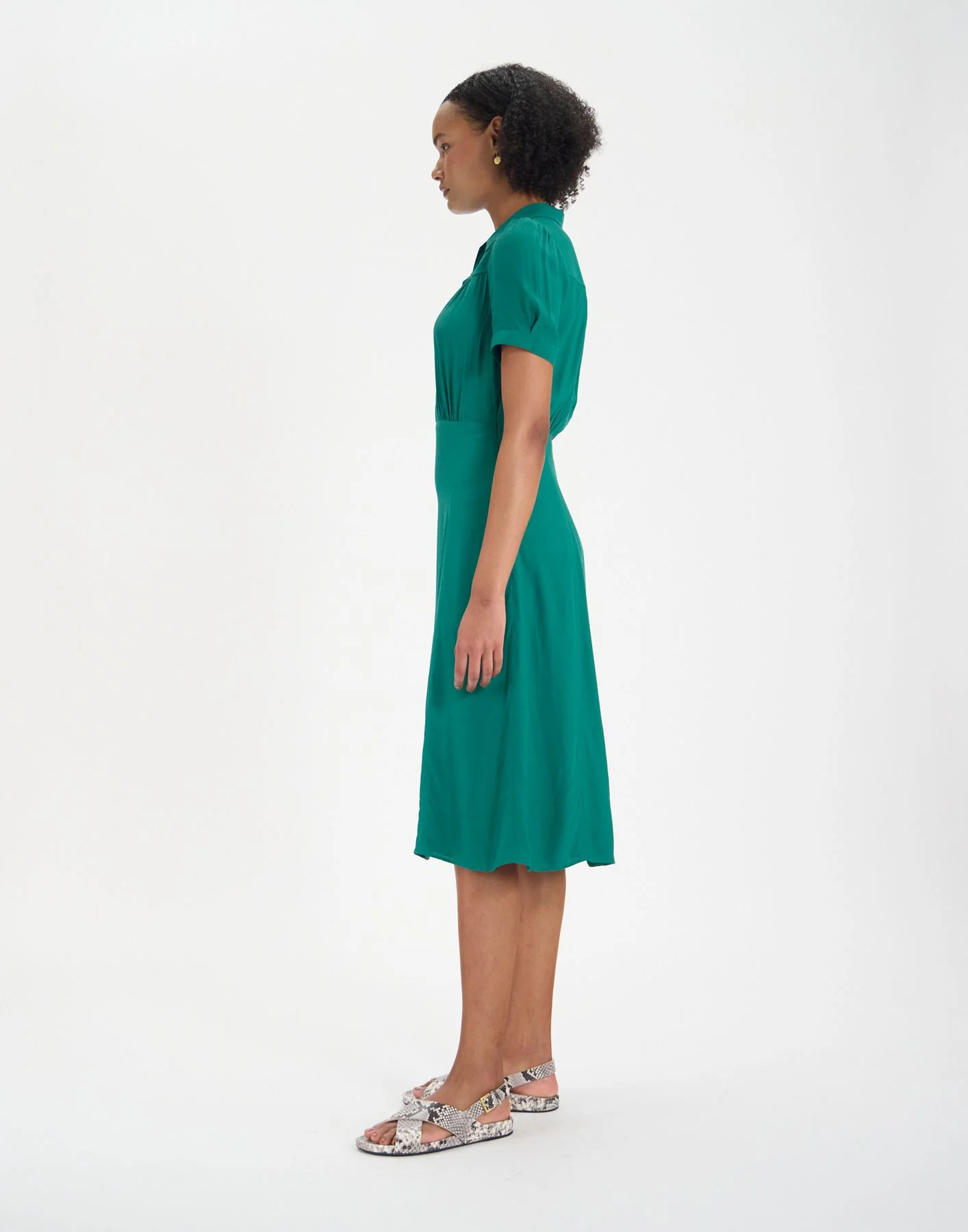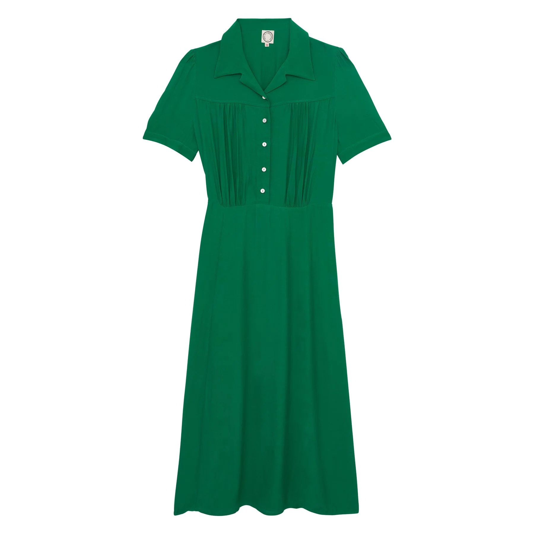 Angèle a tout de la robe parfaite pour l’été ; facile à porter, elle est la garantie d’être élégante en toute circonstance. Elle est proposée ici dans un tissu vert souple et fluide d’une élégance intemporelle. Robe Angèle
