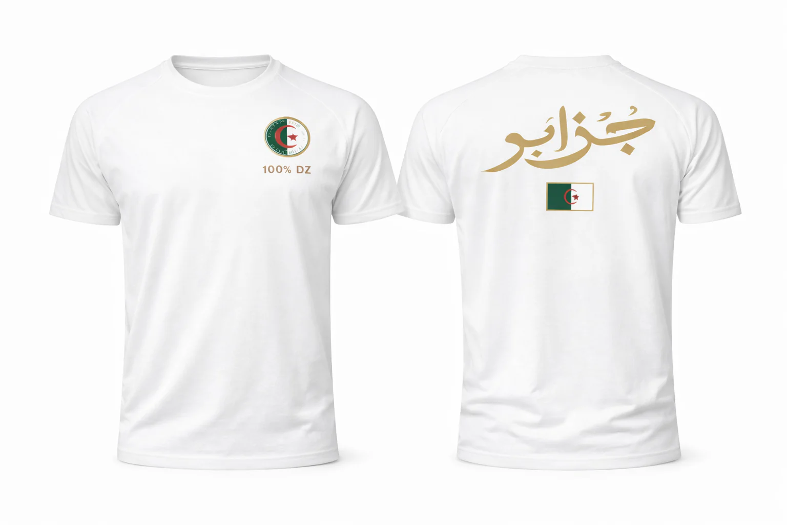 Sur l’avant, un emblème discret côté cœur avec l’inscription 100% DZ, et au dos une grande calligraphie arabe “الجزائر” accompagnée d’un drapeau algérien.