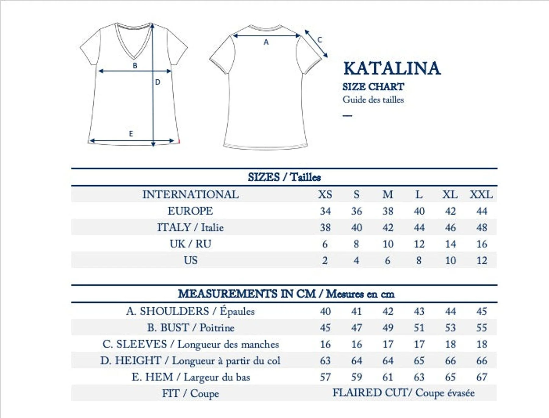 Le nouveau t-shirt Katalina à col V est un concentré d’élégance épurée. Les bords francs apportent une touche décontractée. T-shirt en jersey finCol VManches courtesDétail de galon signature en basBords francsComposition: 50% Coton 50% ViscoseDessiné à ParisFabriqué en EuropeLa mannequin mesure 1m81 et porte du 36