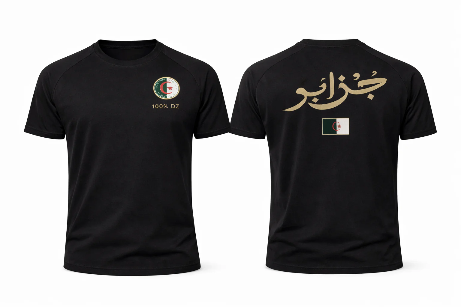 À l’avant, un emblème discret côté cœur avec l’inscription 100% DZ, et au dos une grande calligraphie arabe “الجزائر” accompagnée d’un drapeau algérien pour une finition premium.