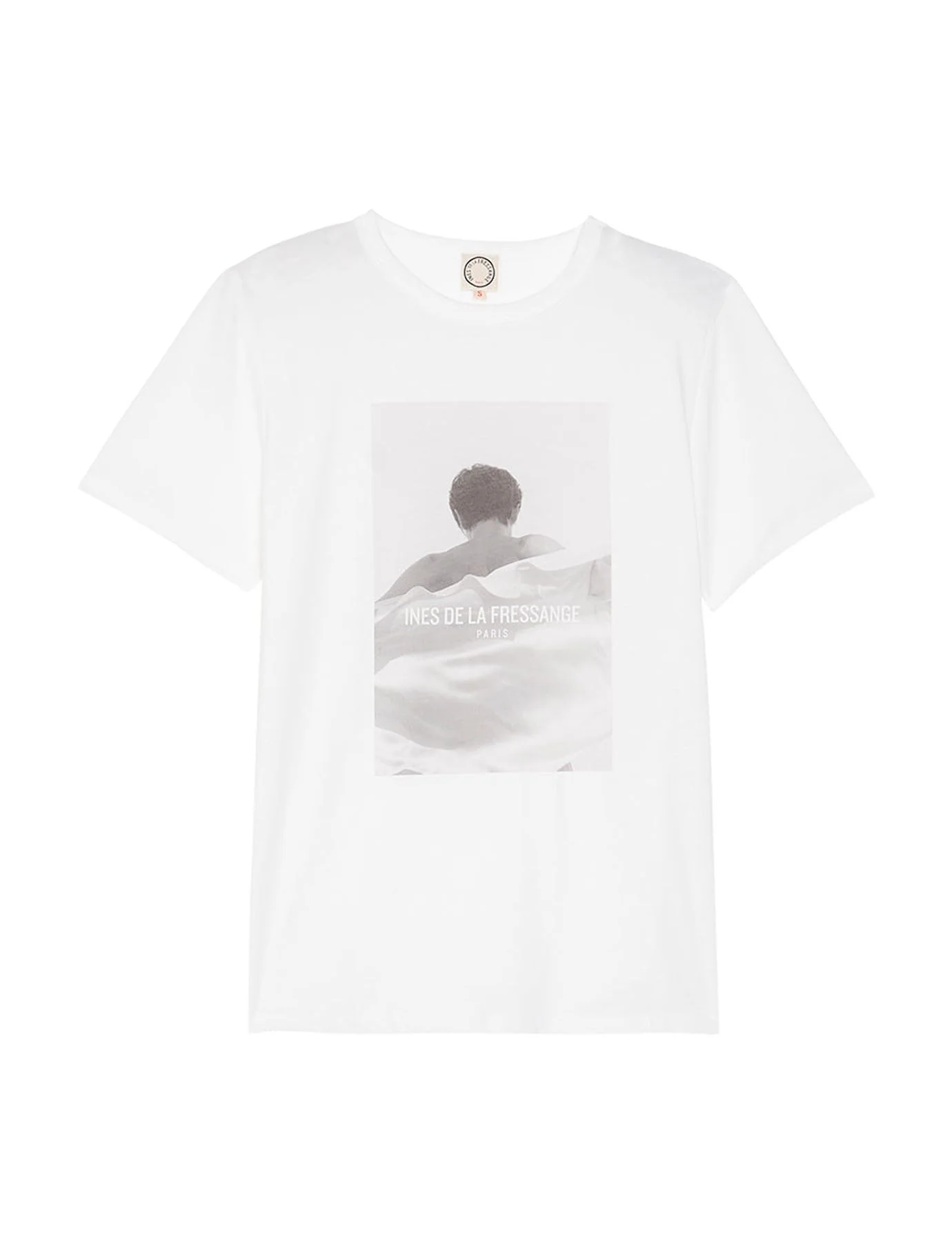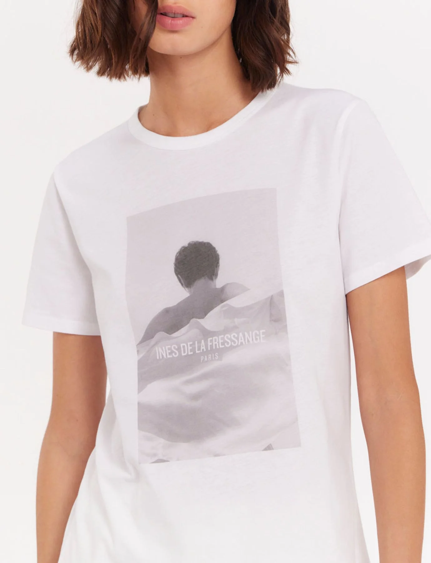 Découvrez le t-shirt Oscar blanc en coton. Ce t-shirt est original avec l’imprimé photo de mannequin avec le logo Ines de la Fressange.T-shirt en jersey