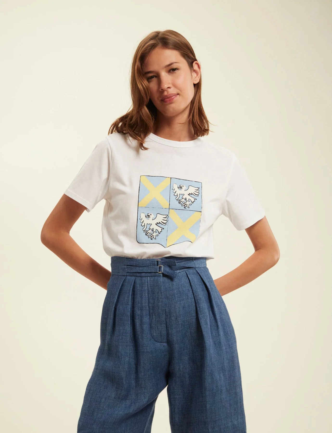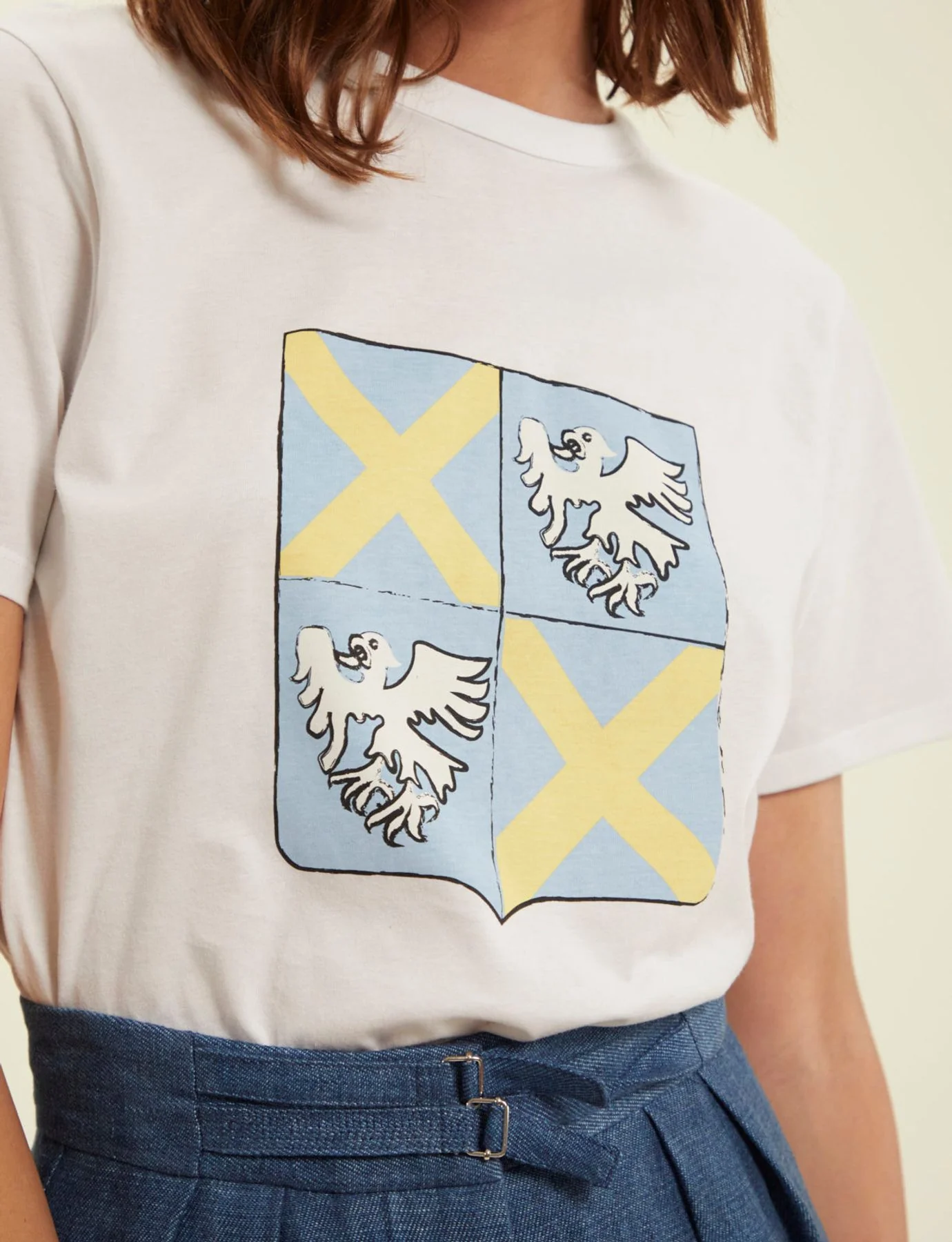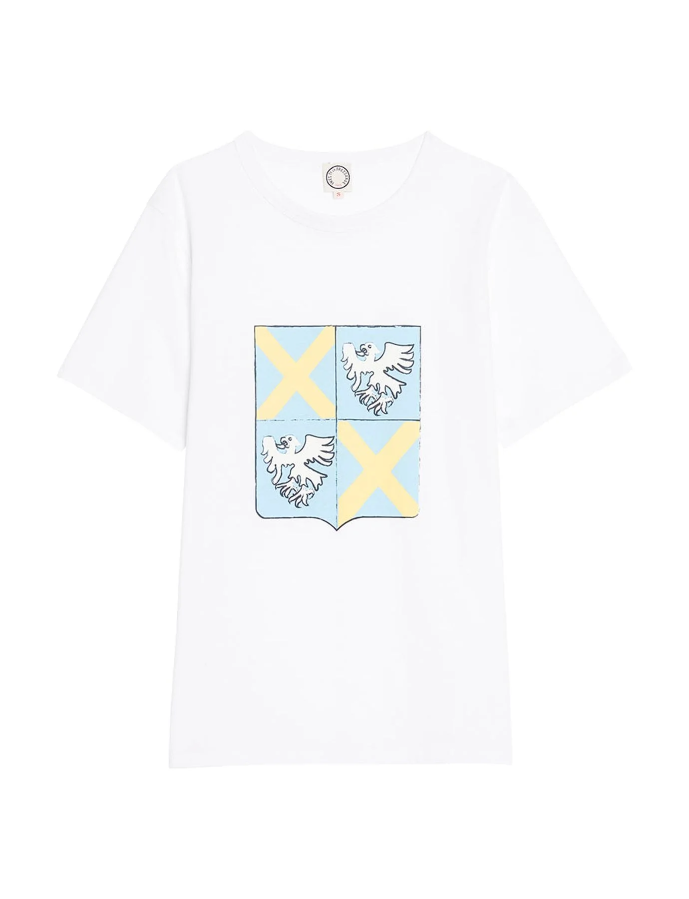Découvrez le t-shirt Oscar blanc avec blason bleu ciel.