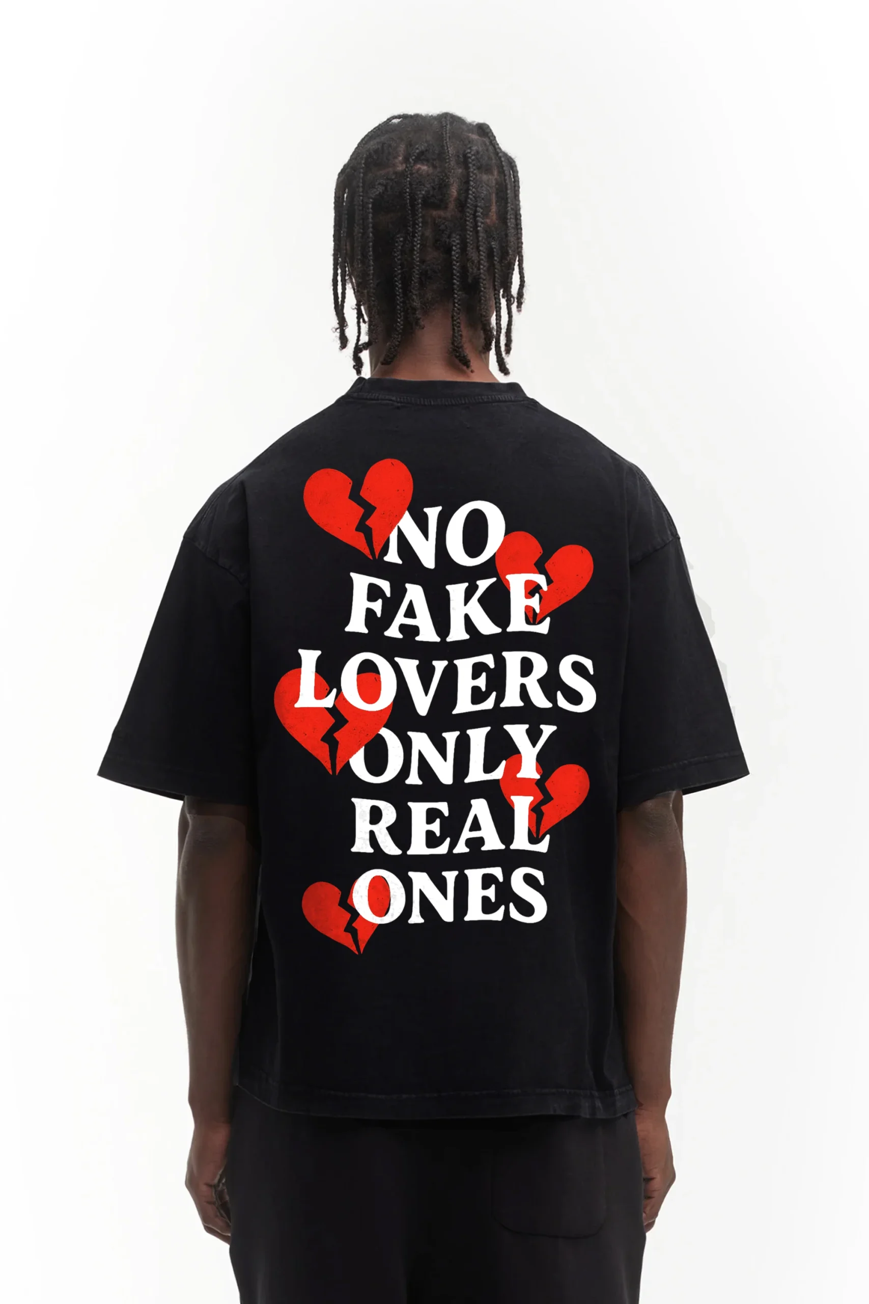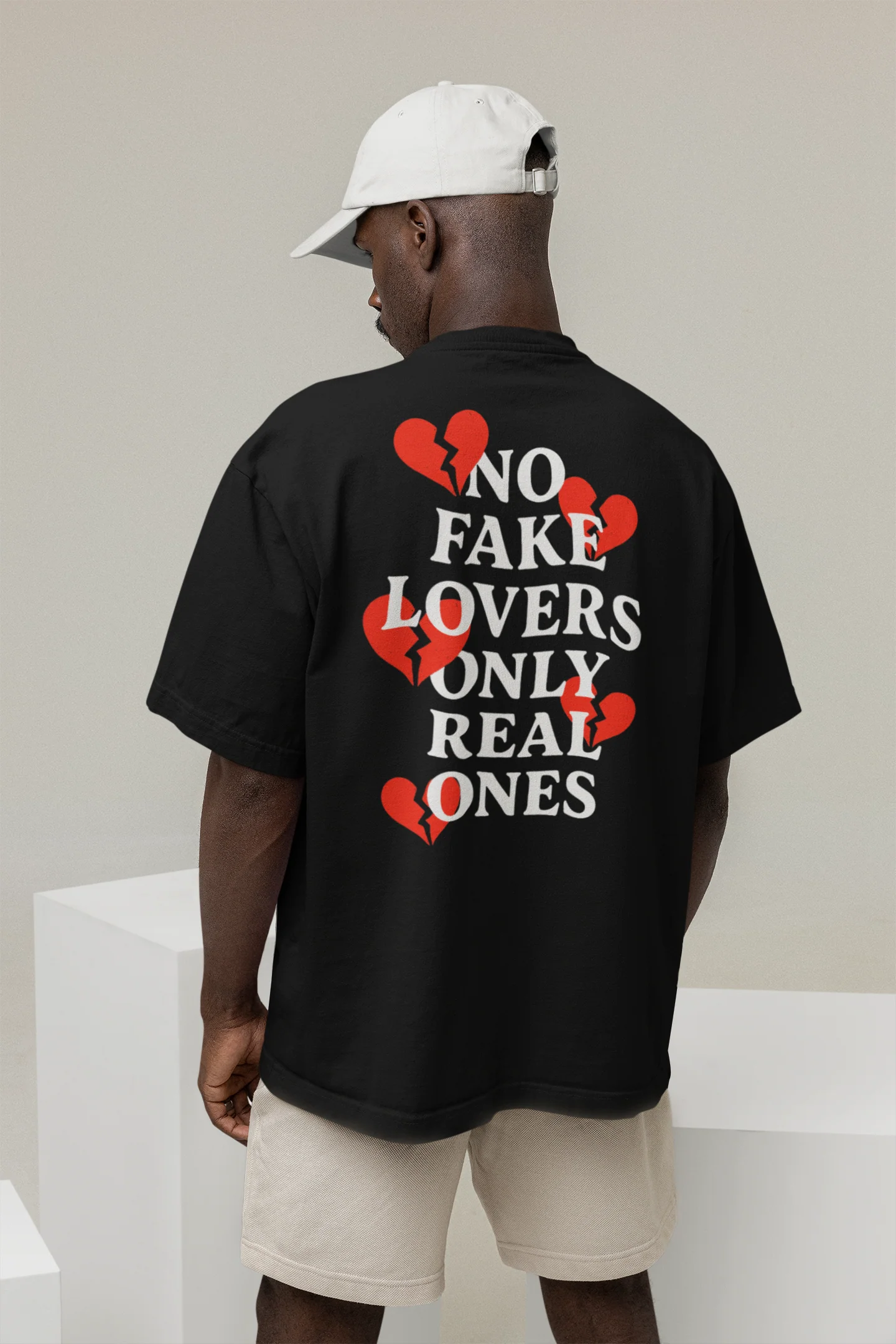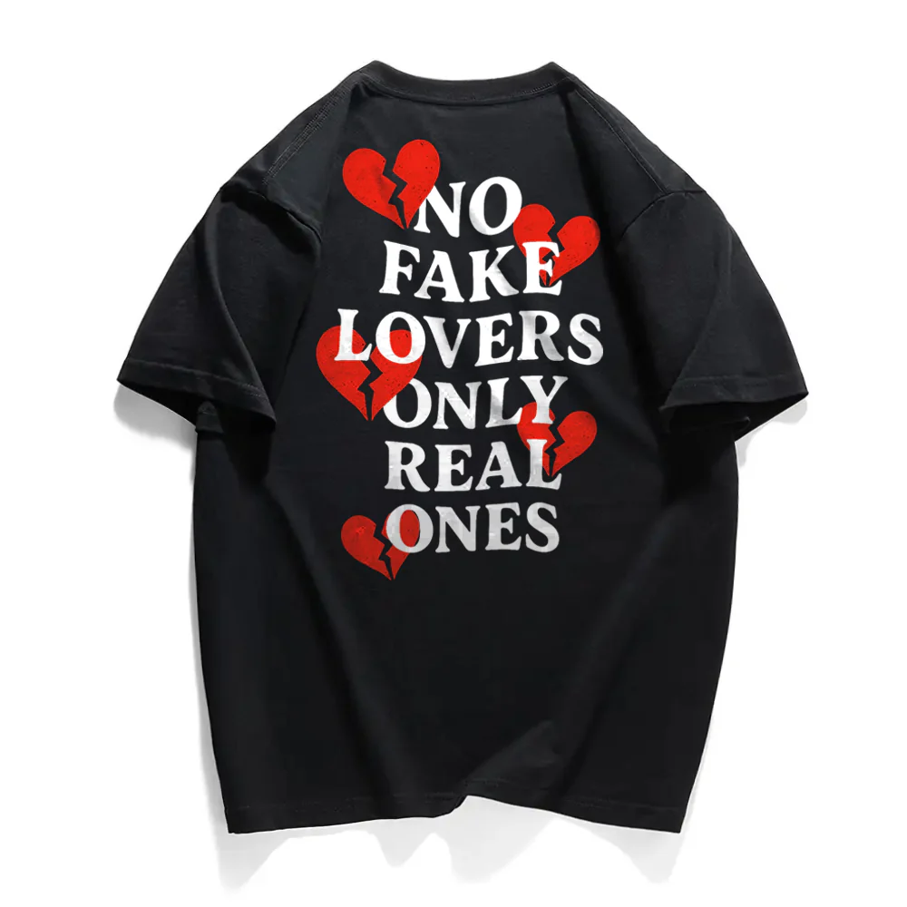 Cette version du t-shirt unisexe épais NO FAKE LOVERS ONLY REAL ONES intègre des éléments visuels symboliques qui renforcent son message. Le design typographique est complété par des cœurs brisés illustrés sur les côtés, représentant des émotions brutes et réelles issues d’une esthétique streetwear. Un vêtement conçu pour ceux qui s’habillent avec attitude et communiquent sans parler.
