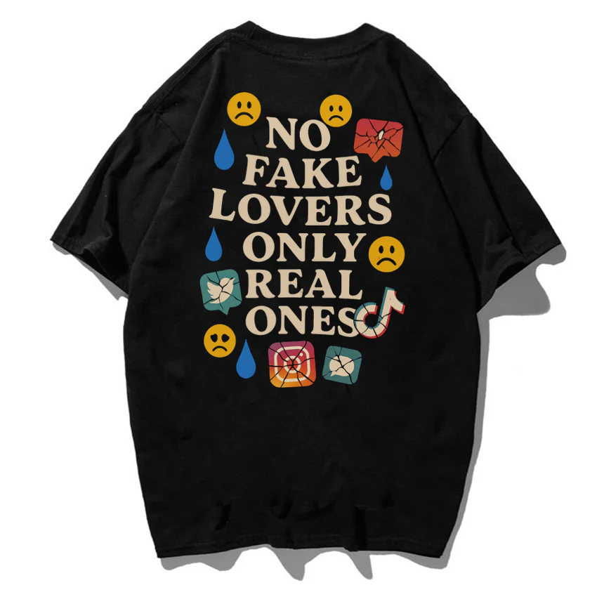 Cette version du T-shirt épais unisexe NO FAKE LOVERS ONLY REAL ONES mélange le message fort de la collection avec une charge visuelle ironique et symbolique. Autour de la phrase principale se trouvent des émojis tristes, des larmes, des cœurs brisés et des logos de réseaux sociaux déformés. Une critique visuelle directe des relations vides, de la posture numérique et du manque d’authenticité. Idéal pour ceux qui s’expriment avec style, mais aussi avec conscience.