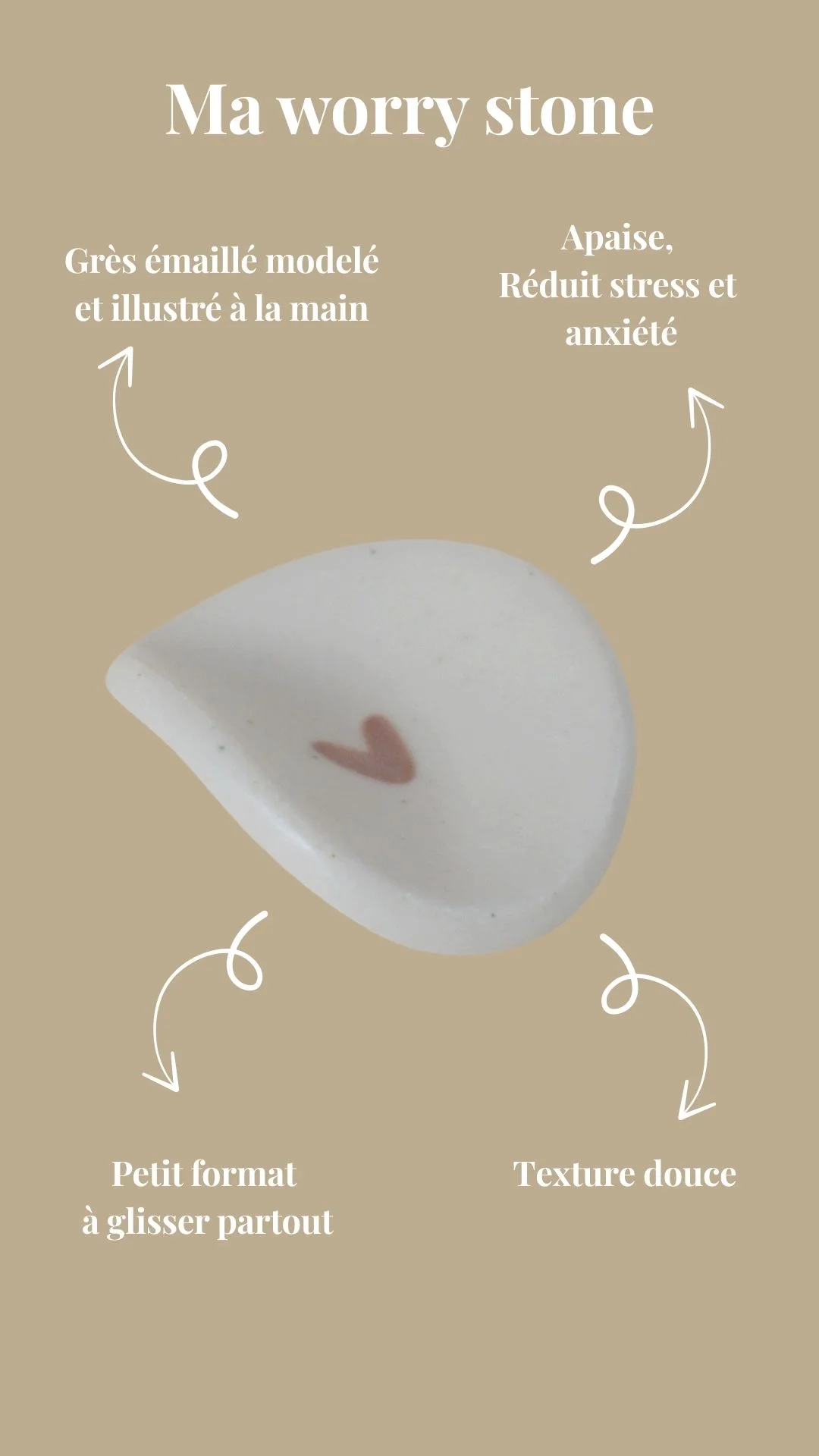 Ce petit galet en grès émaillé modelé et illustré à la main s’inspire des « worry stones » ou pierres à soucis, il vous offre bien-être et apaisement. Placé entre le pouce et l’index, faites glisser votre pouce dans son creux dans un mouvement de va et viens. Ce geste simple procure immédiatement calme et détente, favorise votre équilibre intérieur. Il pourra être emporté partout, glissé dans votre poche, dans un sac. Un petit talisman au design épuré à garder près de soi. Il pourra même vous accompagner le jour de votre accouchement…