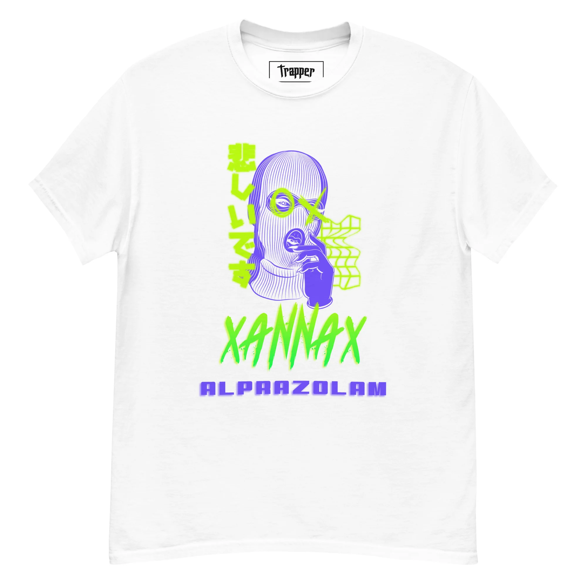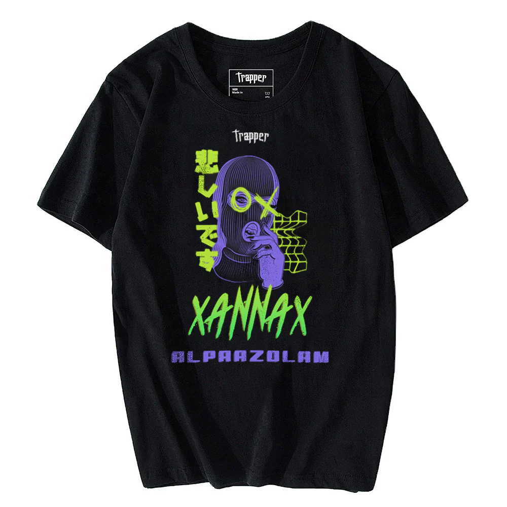 Le t-shirt Trapper « Xannax » est une déclaration visuelle audacieuse, faisant directement référence à l’esthétique cyberpunk, au trap numérique et au glitch art. Orné d’un motif néon central, il associe un personnage masqué façon cagoule à un texte japonais triste et à des effets graphiques déformés. Ce modèle est parfait pour ceux qui s’affranchissent des conventions et trouvent leur style dans le dark, l’alternatif et le numérique.